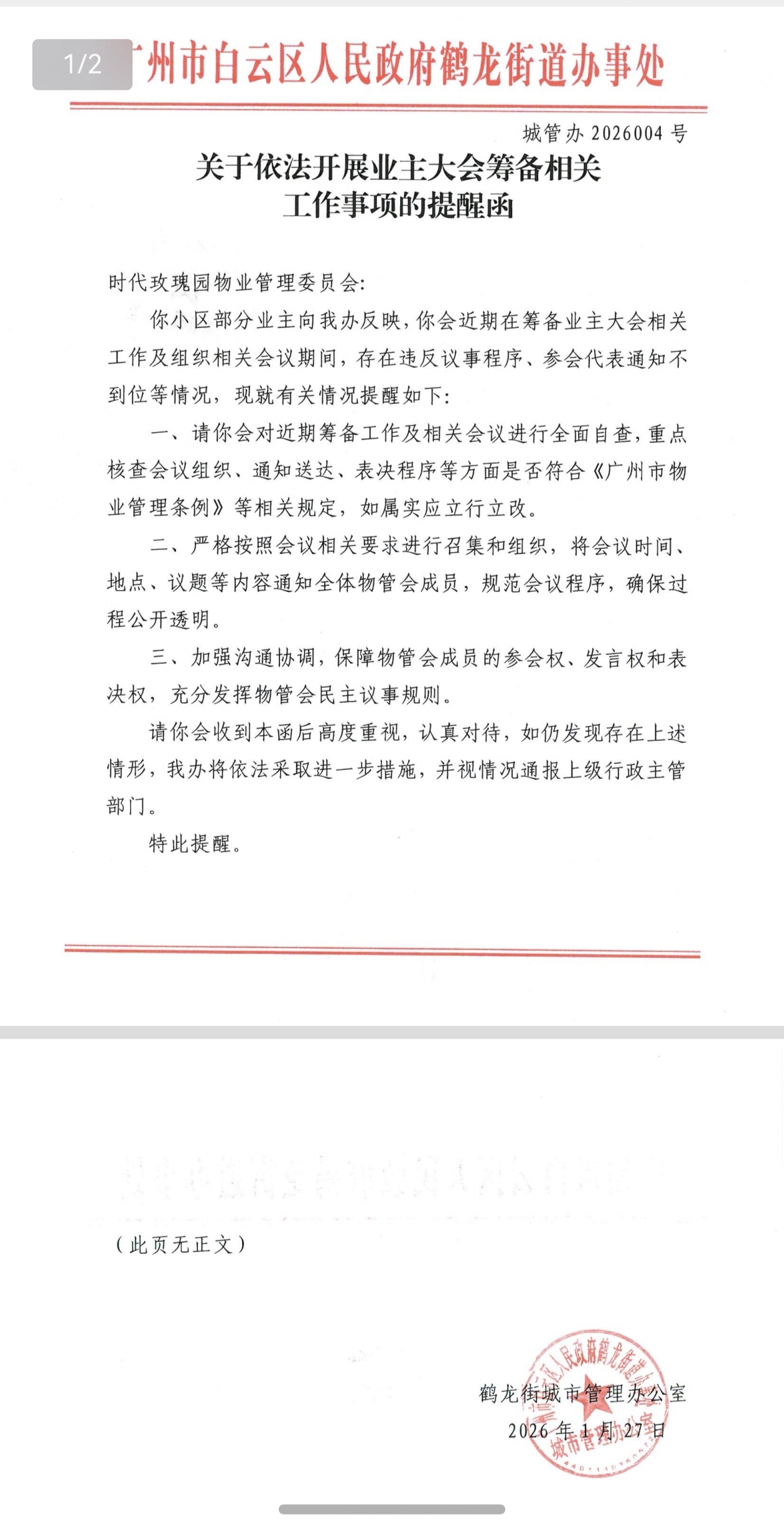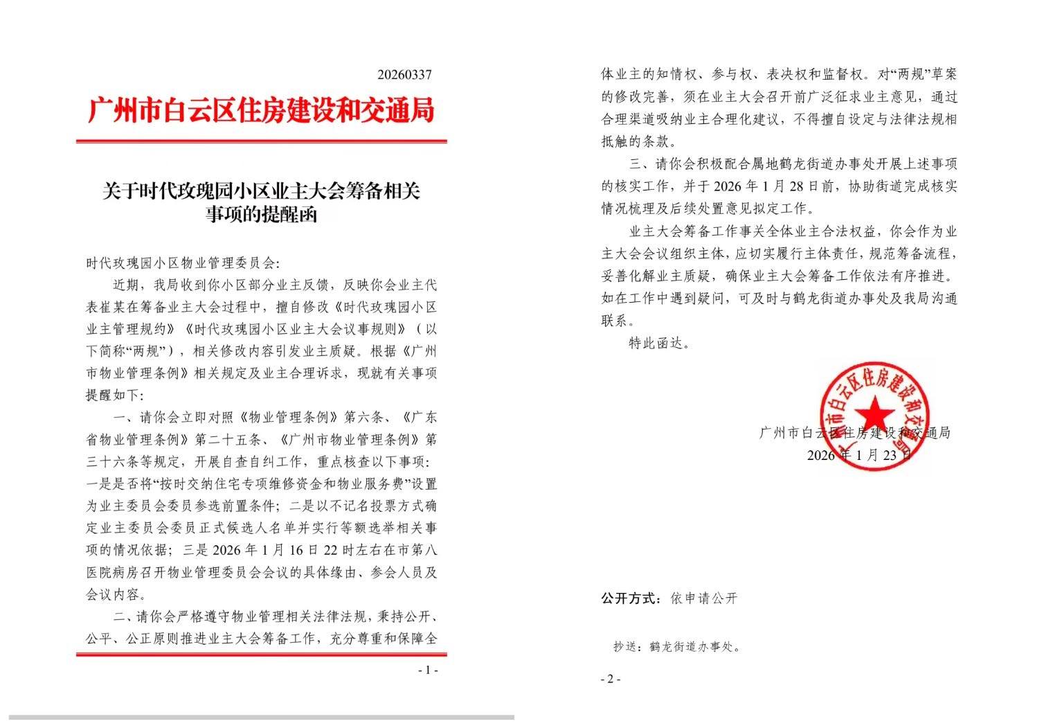物管会的有关决定在时代玫瑰园掀起轩然大波,广大业主纷纷向政府部门投诉。1月27日,白云区鹤龙街道办向时代玫瑰园物管会发出《关于依法开展业主大会筹备相关工作事项的提醒函》,内容如下:一、要求对近期筹备工作及相关会议进行全面自查,重点核查会议组织、通知送达、表决程序等方面是否符合《广州市物业管理条例》等相关规定,如属实应立行立改。二、严格按照会议相关要求进行召集和组织,将会议时间、地点、议题等内容通知全体物管会成员,规范会议程序,确保过程公开透明。三、加强沟通协调,保障物管会成员的参会权、发言权和表决权,充分发挥物管会民主议事规则。