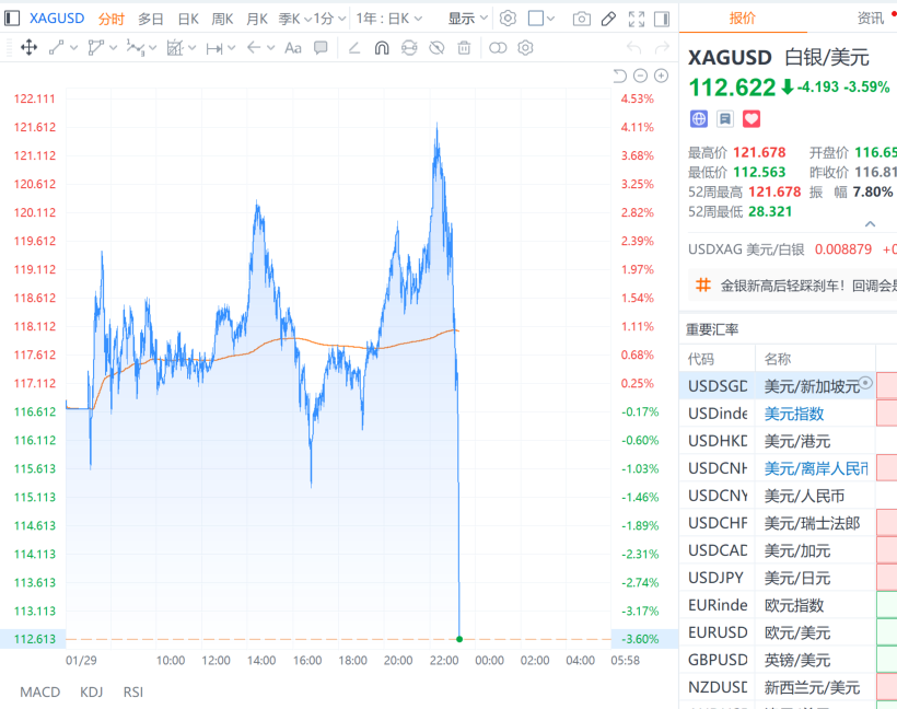 现货白银价格快速跳水,跌超4%,一度跌至112美元/盎司,1个小时前还曾大涨4%。