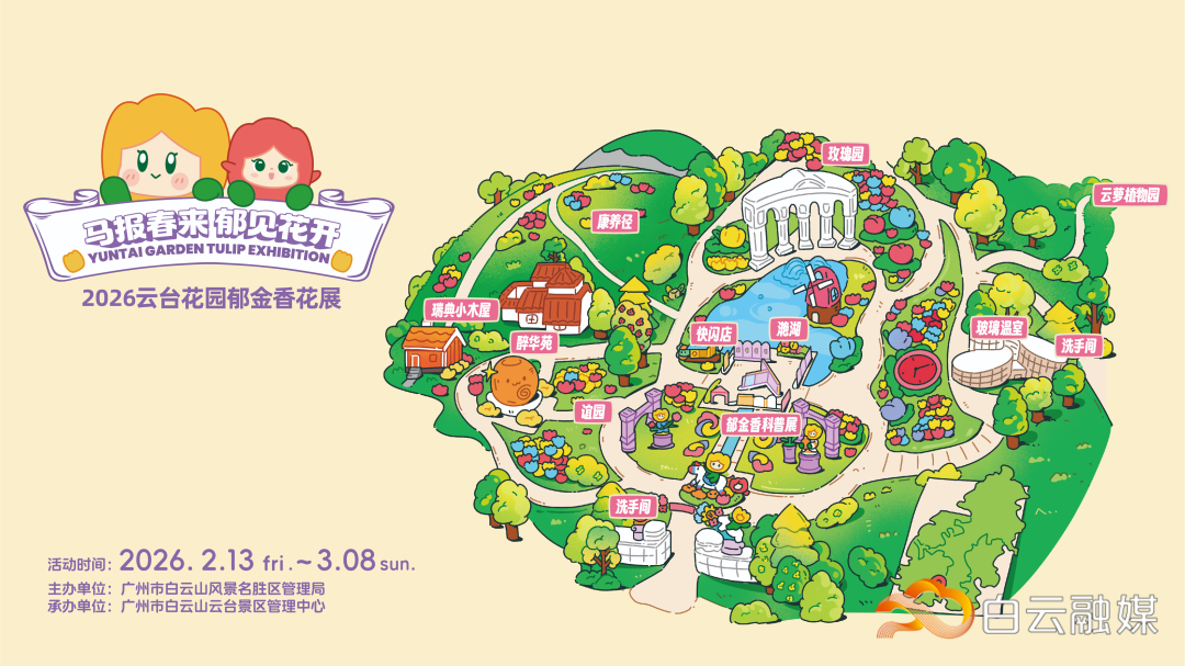 2月13日—3月8日,云台花园将开展“马报春来 郁见花开”2026年郁金香花展,超20个品种、10万株郁金香,搭配近20万盆各色时花,组成绚烂花海,夜皇后、重瓣雪莉亚等稀有品种将首次亮相。主办方将同步策划广州首个郁金香户外科普特展,还有“大湾鸡”和“花金金、花嘟嘟”两大顶流IP春节跨界融合。届时,云台花园玻璃温室也将焕新亮相,集中展示超过200种典型沙生及旱生植物景观群落。