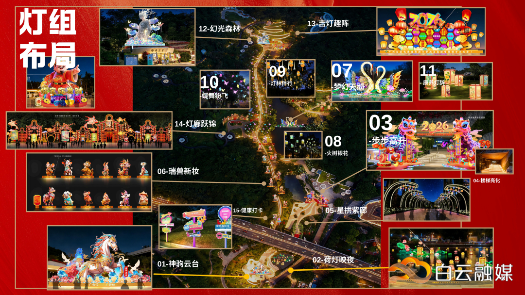 云萝植物园花漾迎春灯会将于2月6日至3月15日举办。届时,云萝植物园将于夜晚开放,用8组大型灯组及沿路氛围灯烘托节日气氛,以马年为主题,融合云萝植物园场景,让园景在白天成为艺术打卡装置,在晚上则变身璀璨打卡点,传递新春气息。