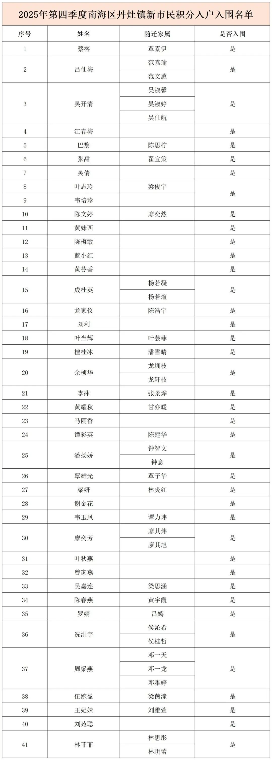 2025年第四季度南海区丹灶镇新市民 积分入户入围名单通告 2025年第四季度南海区丹灶镇积分入户积分分数公示期(2026年1月23日至1月29日共五个工作日)已结束。根据《佛山市新市民积分制服务管理办法》(佛府办〔2023〕20号)和《关于南海区2025年度各镇(街道)按季度分配积分入户指标数的通知》规定,该季度丹灶镇入户指标数为71个。现本着公平、公正、公开的原则,将第四季度积分入户入围名单予以通告。 市民可关注“南海丹灶”微信公众号或登录“南海政法网”(网址:http://zfw.nanhai.gov.cn)、佛山市南海区人民政府网(丹灶镇栏目)进行查询。 附件:2025年第四季度南海区丹灶镇新市民积分入户入围名单 丹灶镇新市民积分制服务管理 工作协调小组办公室 2026年1月30日