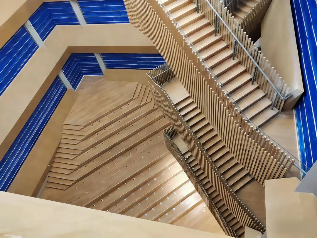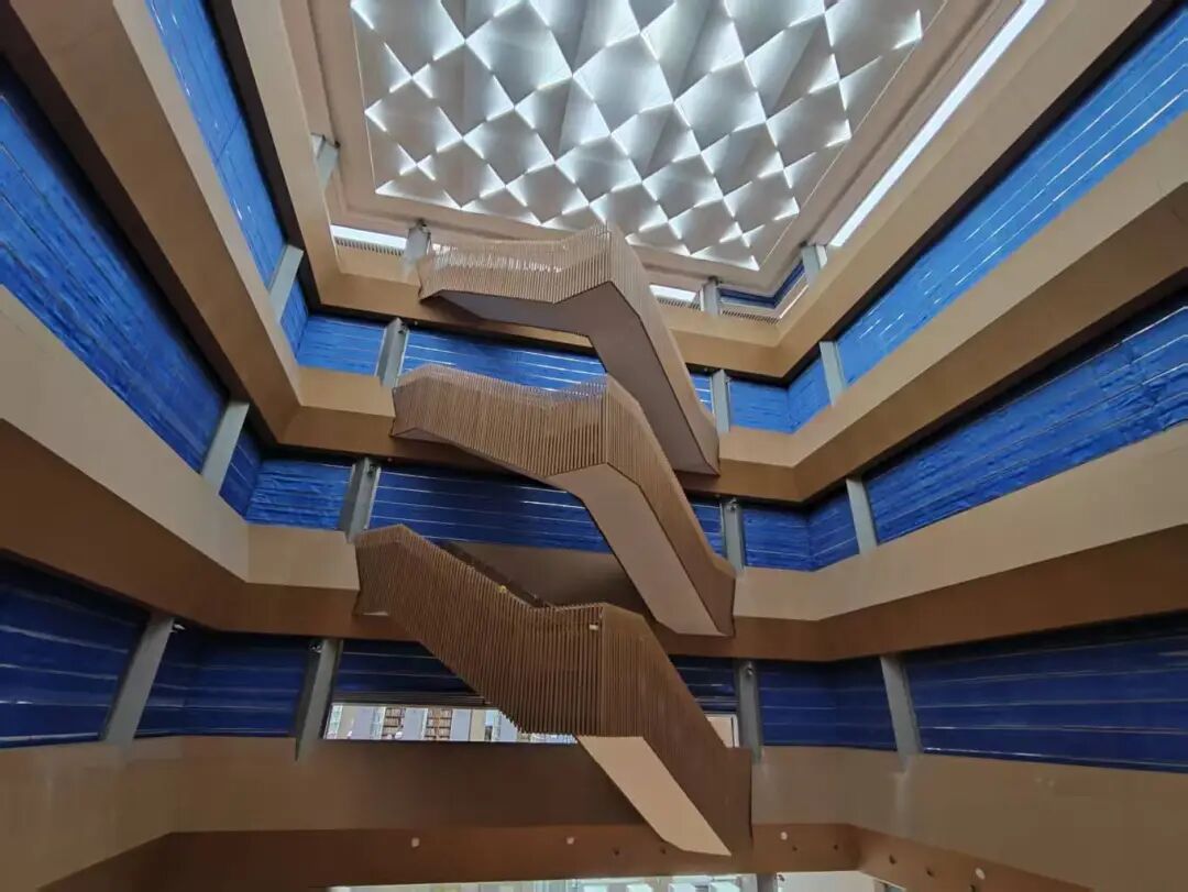 图为南海图书馆新馆中庭区域,中庭天面采取三角棱面设计,造型独特美观;中庭底部的大台阶拟打造为阶梯式演讲区,可充分满足读者的文化交流需求。
