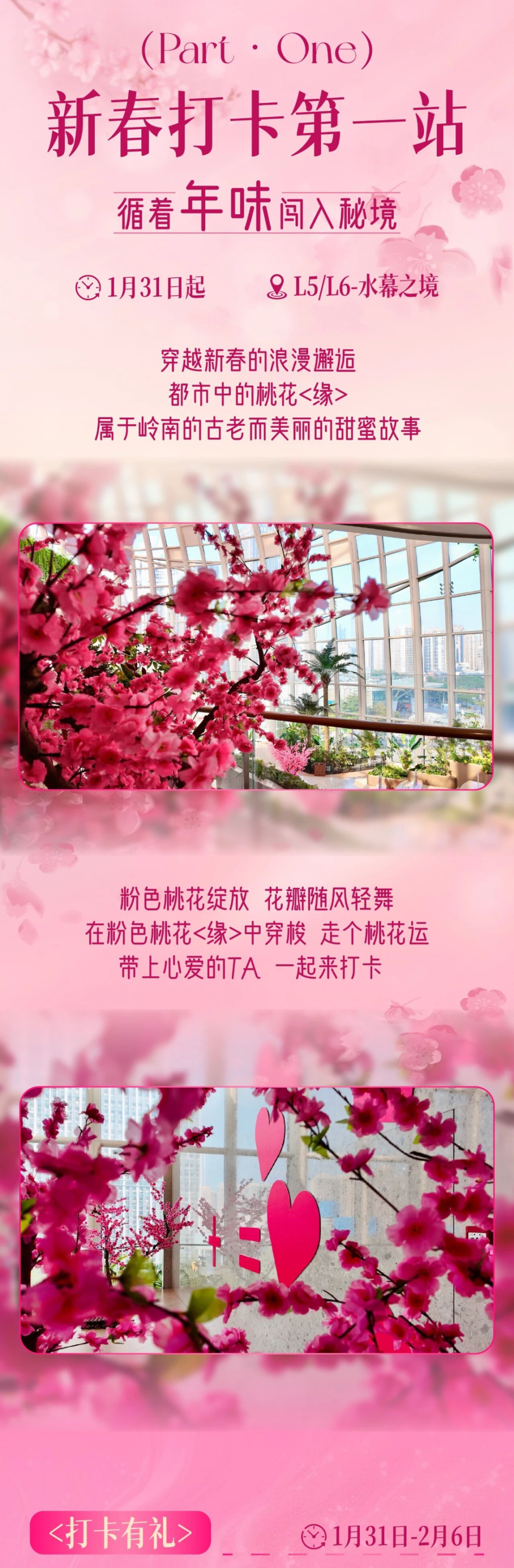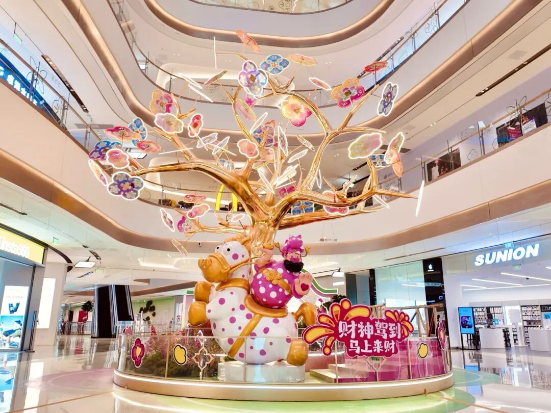 新春打卡第一站,肯定是金铂中心的浪漫桃花林,花瓣随风轻舞,带上心爱的TA在花中穿梭,祈求新年好运气~金铂中心中庭的“四喜财神”主题装置也已上线,搭配许愿树景观,将传统祈福文化以现代艺术形式呈现,欢迎市民来拍照打卡。