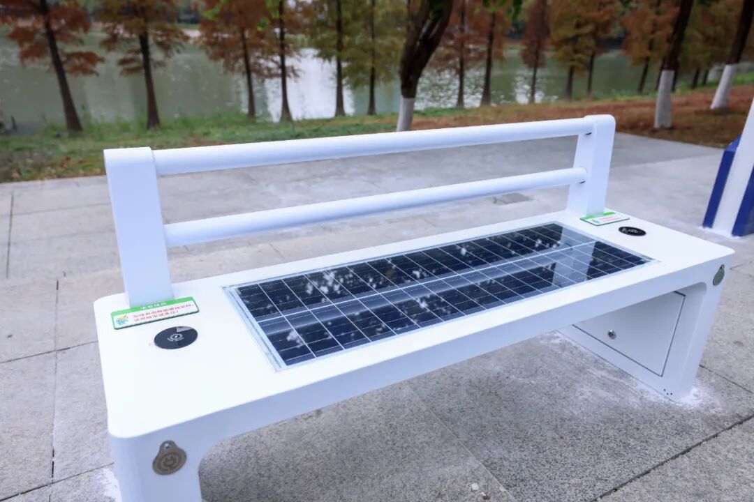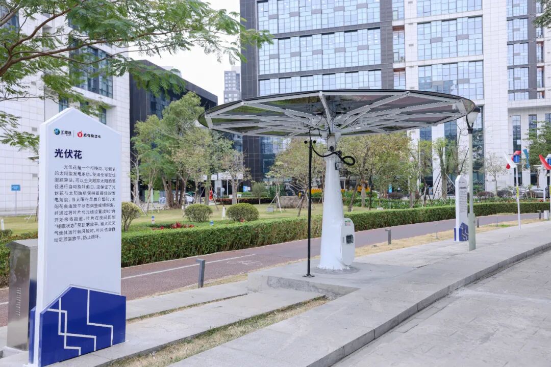 河边凉亭搭载轻量化钙钛矿光伏组件,无需拆改原有结构便华丽变身绿色电站;伞状光伏座椅、光伏花等特色设施错落分布,其中光伏花凭借智能追日算法,发电效率较固定式提升25%以上,搭配垂直轴小型风力发电机形成“风光互补”系统,昼夜不间断为园区供能。