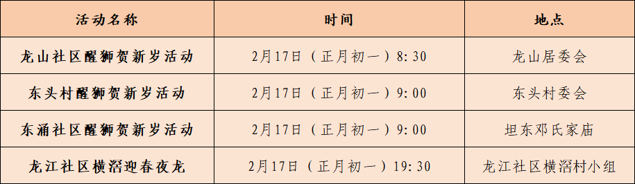 活动地点:龙山居委会、东头村委会、坦东邓氏家庙、龙江社区横滘村小组