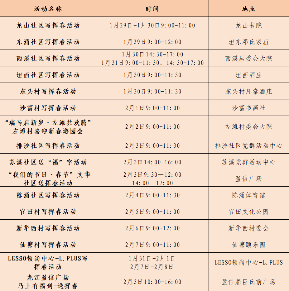 活动简介:春节前夕,龙江镇14个村(社区)和两大商圈将分别邀请书法名家开展春联暖万家活动,为广大群众送上一个有文化品味、有墨香韵味、有丰富年味的春节。