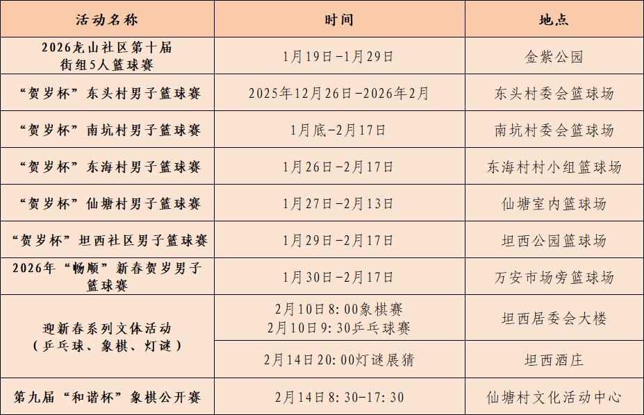 活动简介:本届“康乐杯”涵盖男子篮球、混双羽毛球、青年羽毛球、乒乓球及中国象棋五大项目,旨在丰富社区居民春节文体生活,搭建以赛会友、切磋技艺的活力平台。