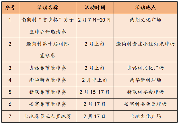 活动简介:这次赛事有“篮”不住的精彩!届时欢迎乡亲们齐聚赛场,为运动健儿喝彩,在呐喊欢呼中感受新春热闹!