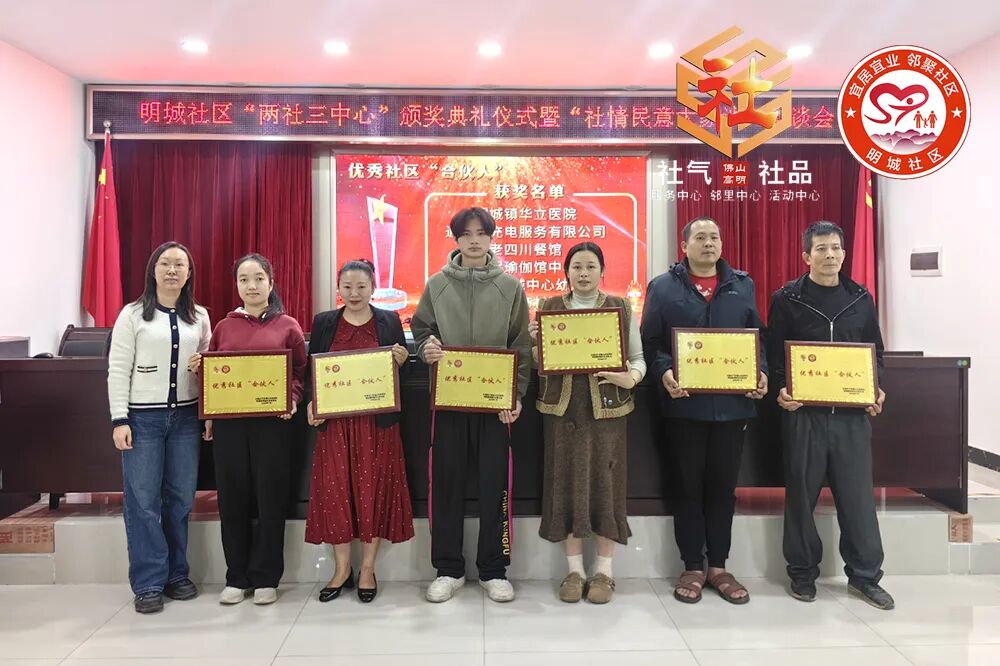 颁奖仪式上,表彰一批在社区建设中表现突出的集体与个人获得荣誉。授予明城华立医院、通万广充电服务有限公司、美熙瑜伽馆中心、老四川餐馆、明城镇中心幼儿园、建珍装饰材料店等多家单位优秀社区“合伙人” 称号;颁发最美志愿者和金牌“和事佬” 奖项;此外,明城花园小区、明汇苑小区获评和善小区。