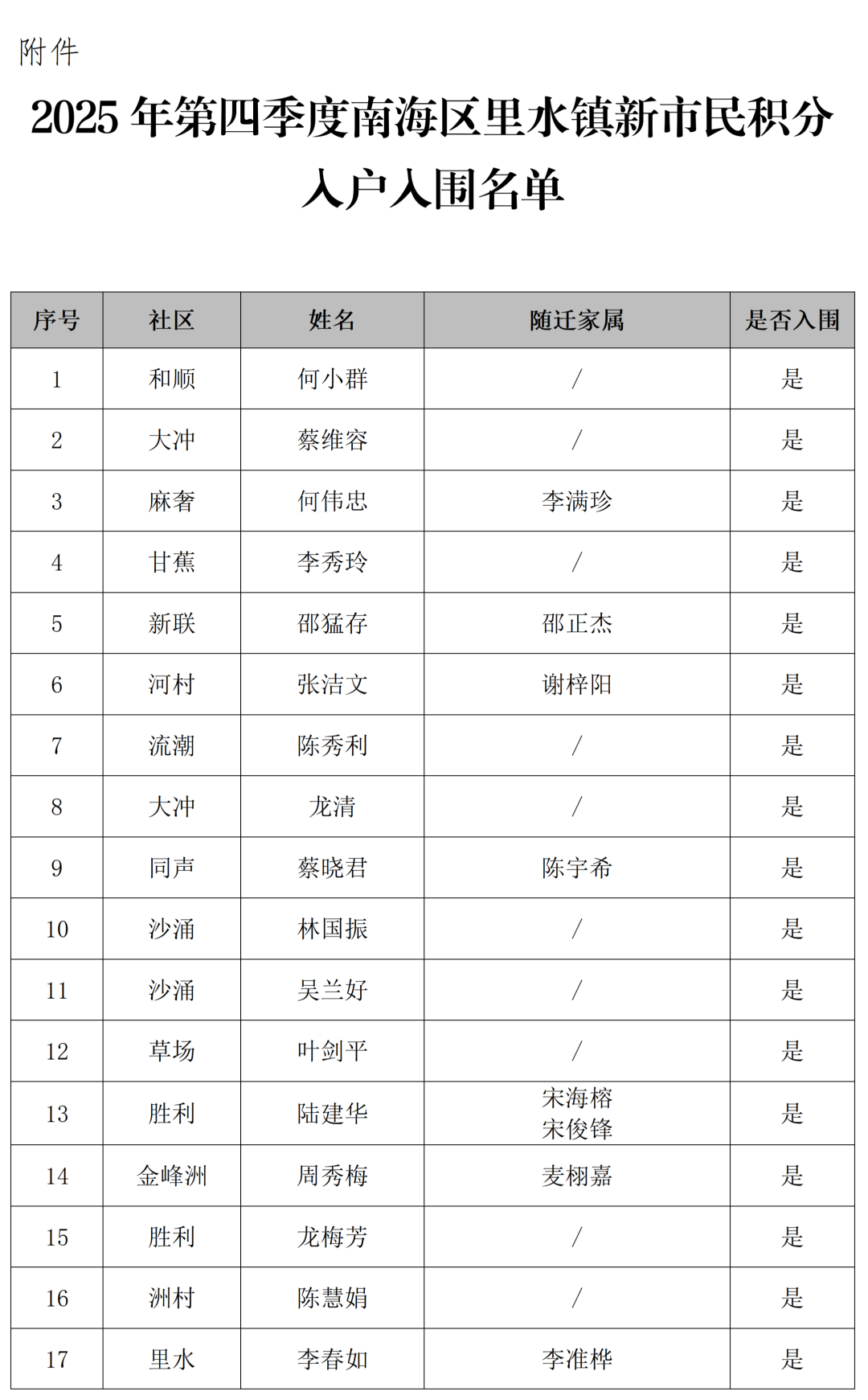 2025年第四季度南海区里水镇 新市民积分入户入围名单通告