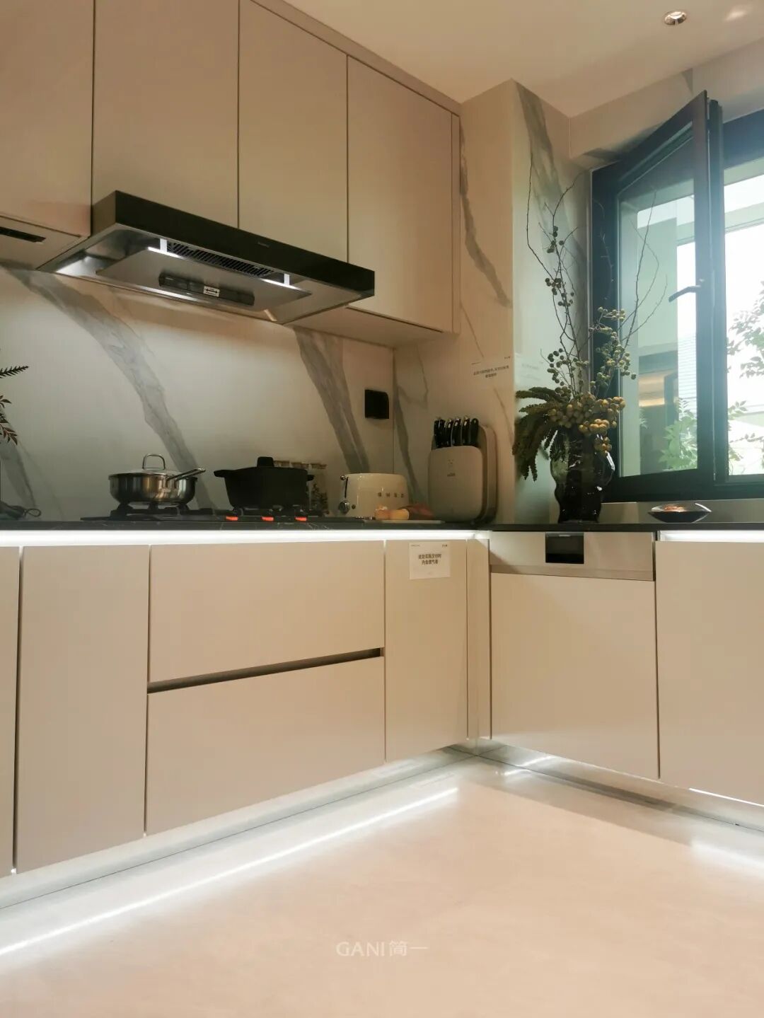 厨房地面,臻选简一·皇家白玉大理石瓷砖,完成奢石级铺装。它并非普通的石材纹理,其灵感源自丹麦的珍稀矿脉,纹理如白色天然玛瑙般独特而奢华。米黄与纯白在其中深浅交织、叠合晕染,既彰显了白玉的冰澈纯净,又蕴藏着温润如脂的玉质感。