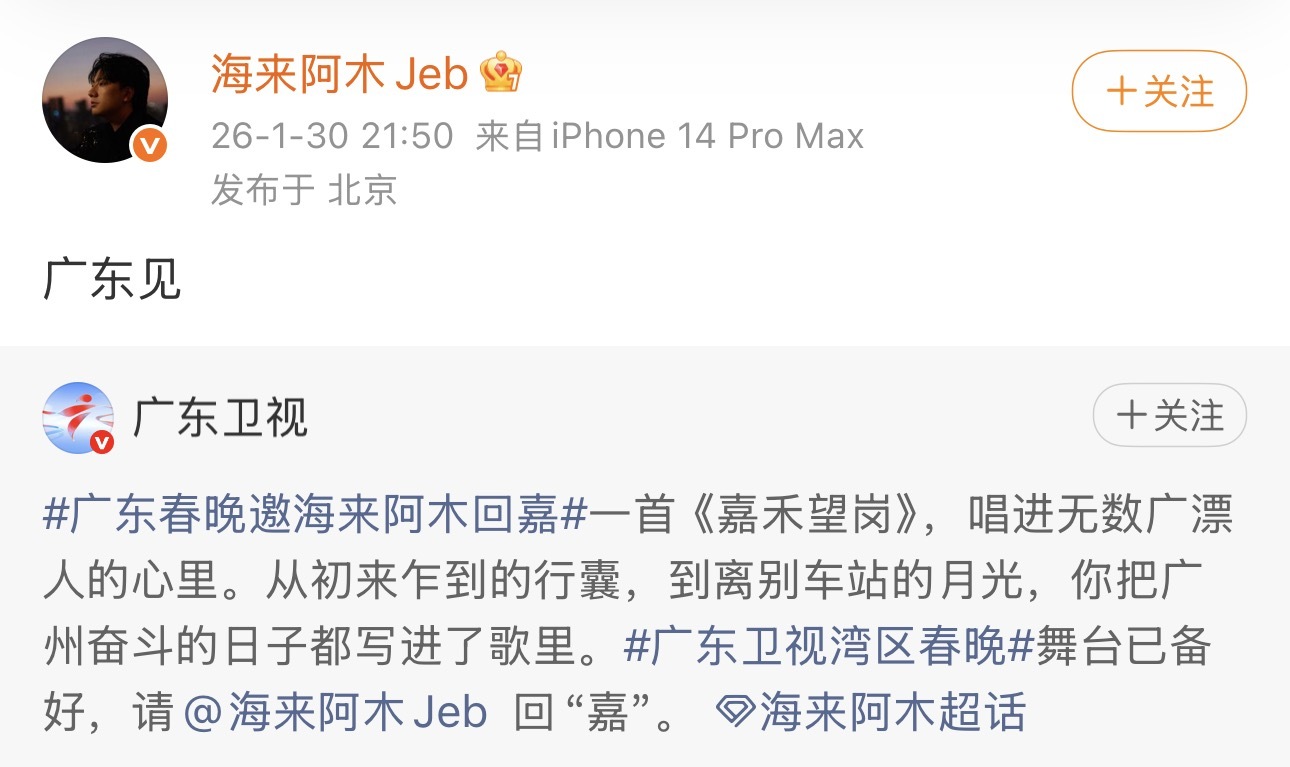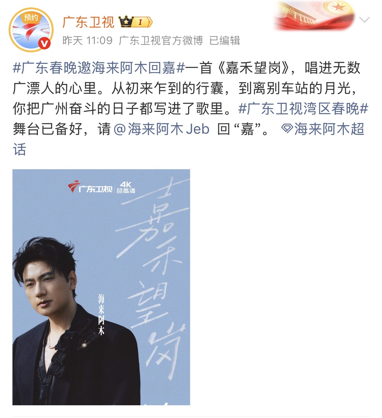 “一首《嘉禾望岗》,唱进无数广漂人的心里。从初来乍到的行囊,到离别车站的月光,你把广州奋斗的日子都写进了歌里。广东卫视湾区春晚舞台已备好,请海来阿木回‘嘉’。”