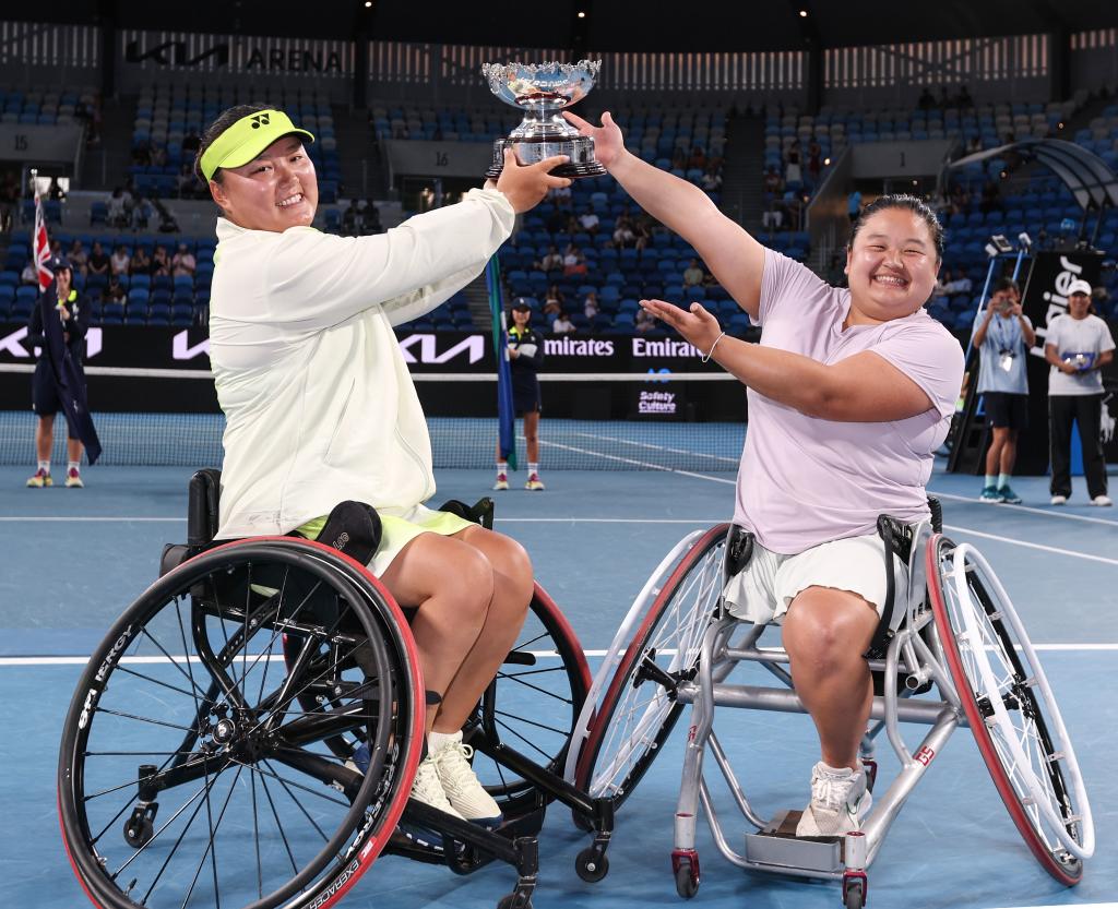 李晓辉/王紫莹去年在澳网为中国赢得首个轮椅网球大满贯冠军,此番再进轮椅女双决赛,她们直落两盘击败对手,成功卫冕。李晓辉还在当天的轮椅女单半决赛中力克头号种子上地结衣,晋级决赛。