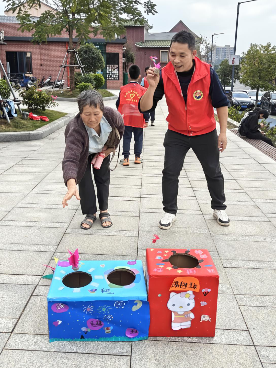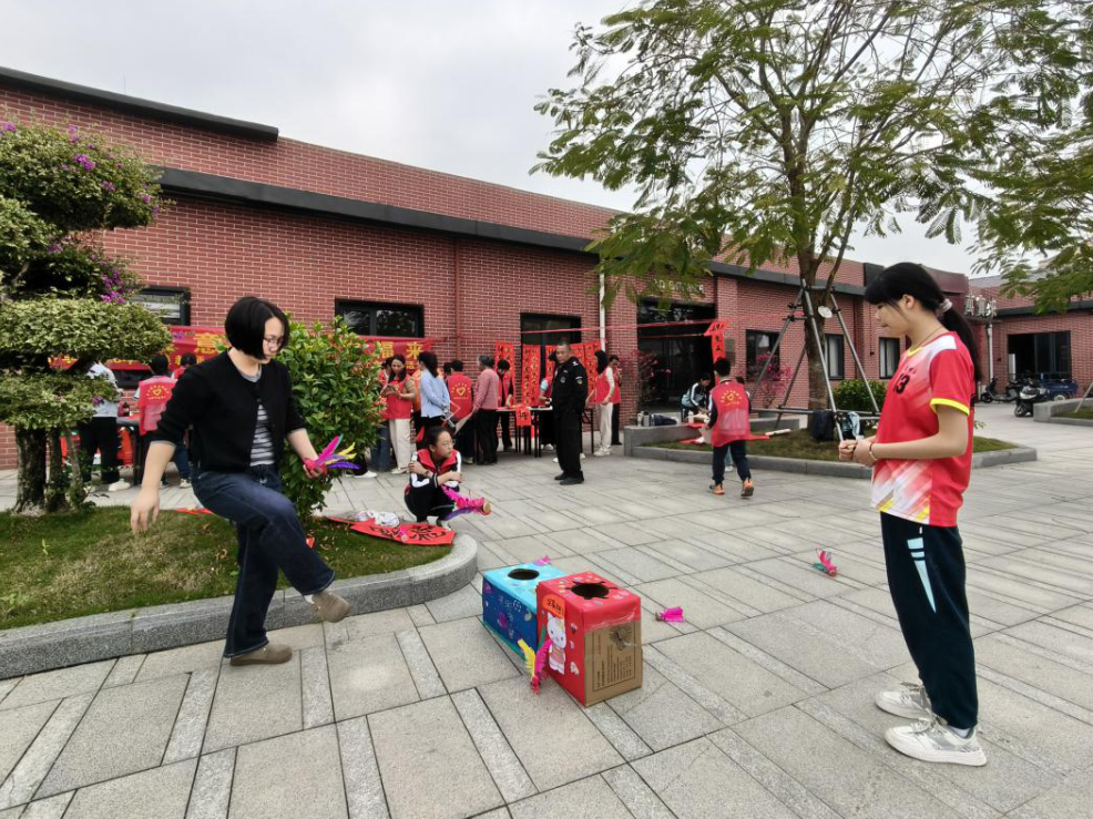 除了写春联、送春联,本次活动还特别设置了“踢毽球入宝盒送福字”互动环节。毽球社团的同学们身手矫健,展示了精彩的花式对踢球表演,并与社区居民欢乐互动。居民通过参与踢毽球游戏,即可获得同学们亲手书写的“福”字,现场笑声阵阵,气氛热烈。来参加活动的李阿姨开心地说:“又能看表演,又能拿福字,这个下午过得真有意义!”