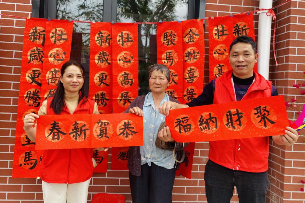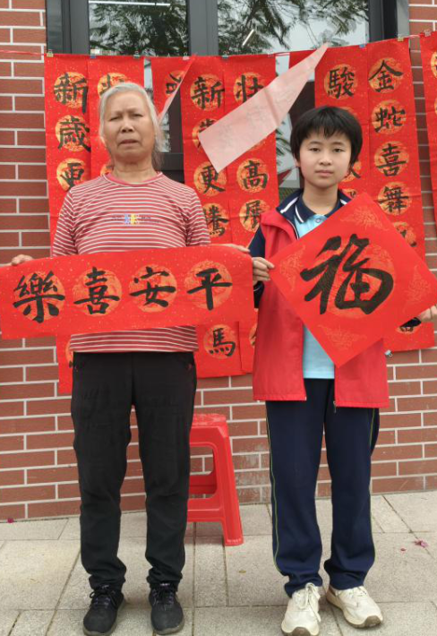 “这字写得真精神!”“小朋友年纪不大,笔下真有功夫!” 村民们一边接过春联,一边连连称赞。七十多岁的爷爷拿着墨迹未干的“福”字,笑得合不拢嘴:“这样的春联比买的更有心意,孩子们写得好,也懂事,真是我们社区的福气啊!”不少村民表示,学生们手写的春联不仅年味更浓,更让这个春节多了一份温暖的牵挂。