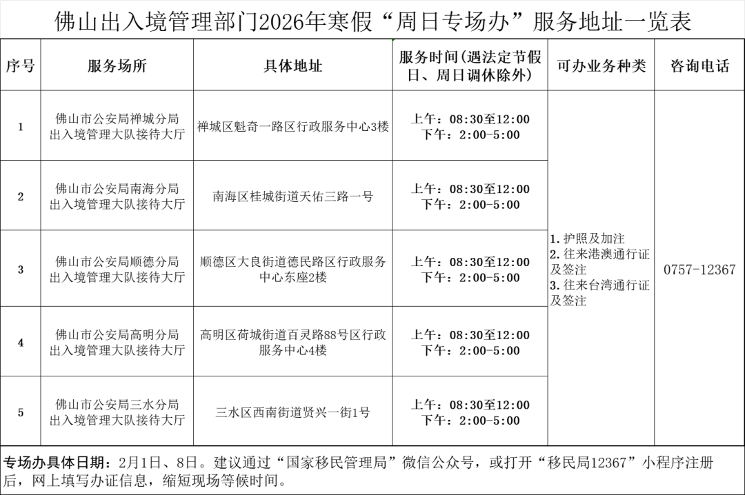 (二)服务地点:佛山公安出入境管理部门五区接待大厅。