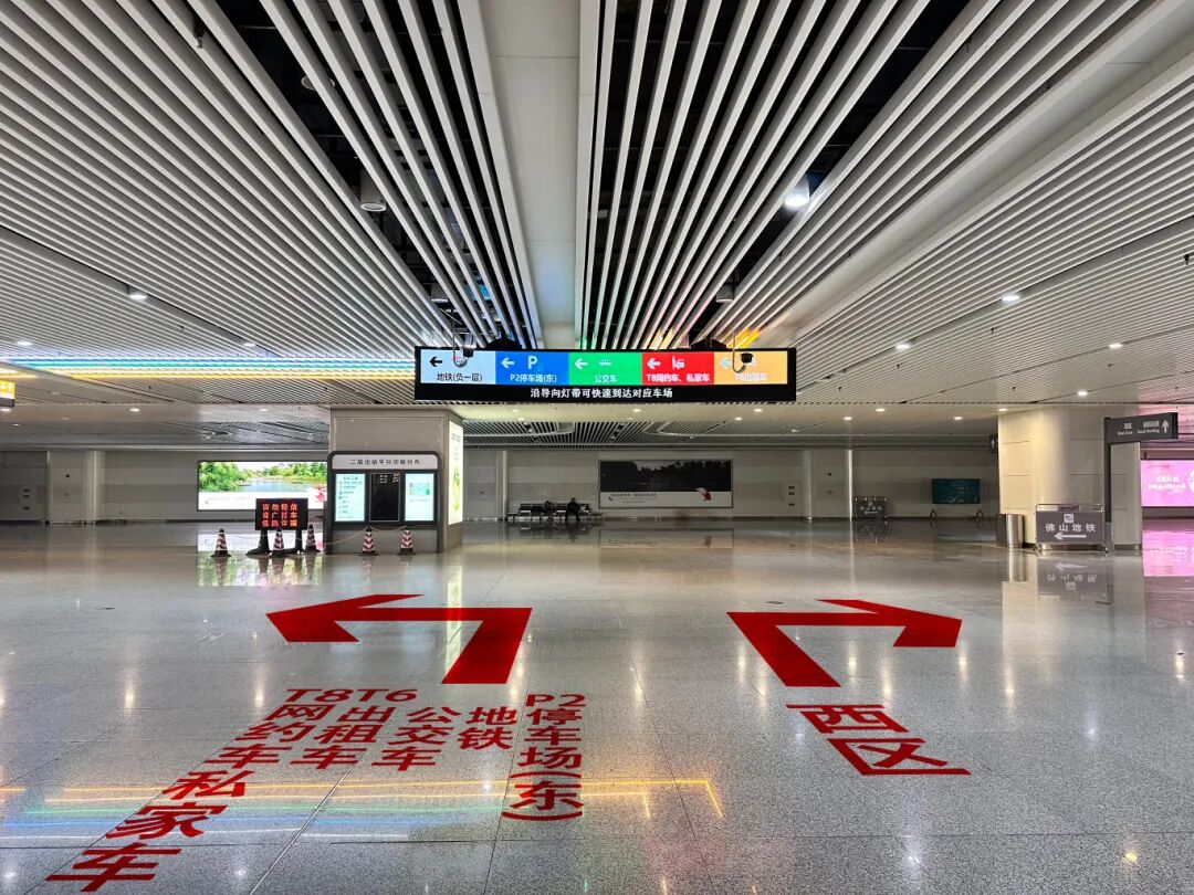 出闸机后,往左可至东咨询台、P2停车场(东),也可换乘地铁、公交、T6出租车、T8网约车私家车接驳(沿导向灯带可快速到达对应车场),往右前往西区。如下图:
