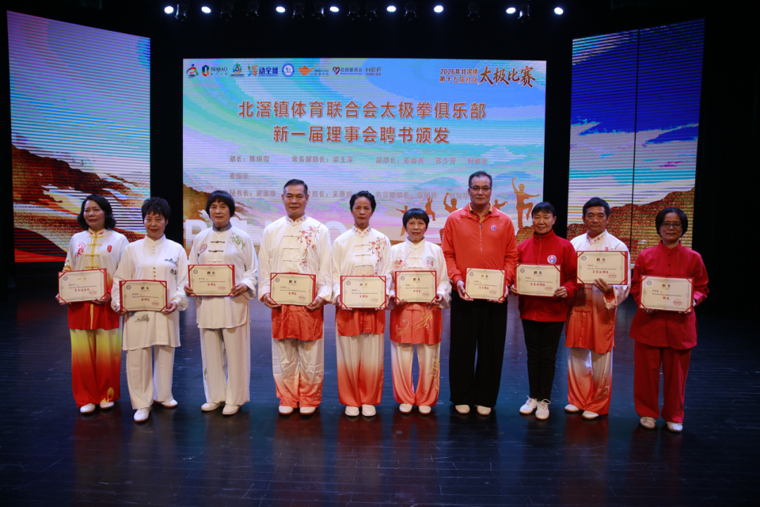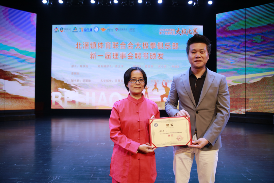 在裁判组紧张统计成绩的同时,现场举行了北滘镇体育联合会太极拳俱乐部换届聘书颁发仪式。北滘镇体育联合会会长苏志波先生为新任部长陈焕霞女士颁发聘书。陈部长随后为常务副部长、副部长、秘书长及名誉部长等新任班子成员颁发聘书。