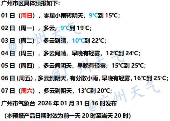 广州市气象台预计,2月1日—2日受冷空气补充影响,广州零星小雨转多云,最低气温下降至9℃左右;陆地阵风4~6级,港区和高地阵风6~8级。2月2日白天起云量减少,气温逐渐回升。