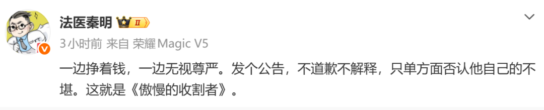 2月1日,法医秦明就此事发表评论:一边挣着钱,一边无视尊严。发个公告,不道歉不解释,只单方面否认他自己的不堪。这就是《傲慢的收割者》。
