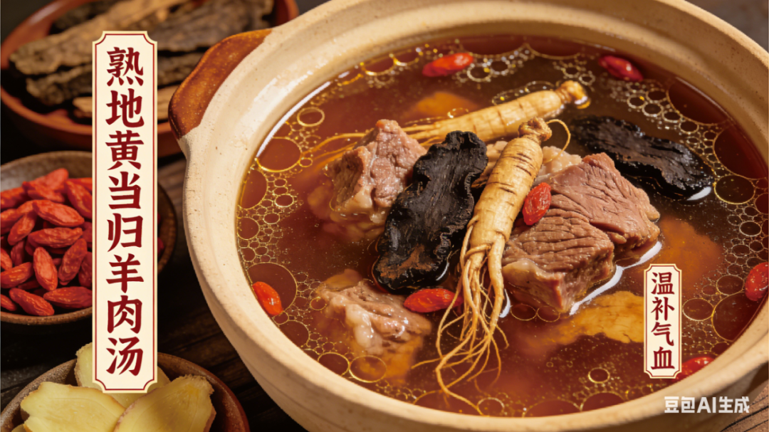 功效:滋阴降火,润肺生津。非常适合秋季干燥或长期熬夜导致的阴虚火旺、口干舌燥、咽喉干痛、睡眠不安。熟地当归羊肉汤