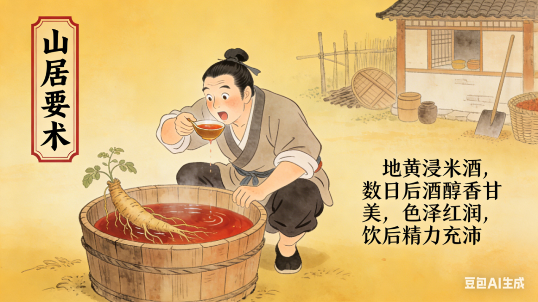 地黄吸黄土精华名“地髓”。南北朝的《山居要术》记:一位农夫在挖出地黄后,将其根茎放在一桶未喝完的米酒中。数日后,他发现那桶本应酸败的米酒不仅没有坏,反而变得醇香甘美,色泽红润,喝后常年劳作而虚弱无力的身体,竟然感觉精力充沛,疲惫全消。这个发现认识到地黄具有“补虚健体”的功效。东晋葛洪《抱朴子》里则写了一位“楚文子”,坚持服用地黄八年,最后能在夜里读书写字,“夜视有光”,被古人视为“久服延年”。旧时药铺常挂这样一副对联:“神州到处有亲人,不论生地熟地;春风来时尽著花,但闻藿香木香”。上联把生地黄与熟地黄拟人化为“亲人”;下联又把药香与花香并列,药铺里一年四季都吹着药香的风。