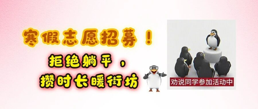 招募对象:青年大学生,每天负责1小时的作业辅导课程及协助社区寒假托管活动维持秩序。