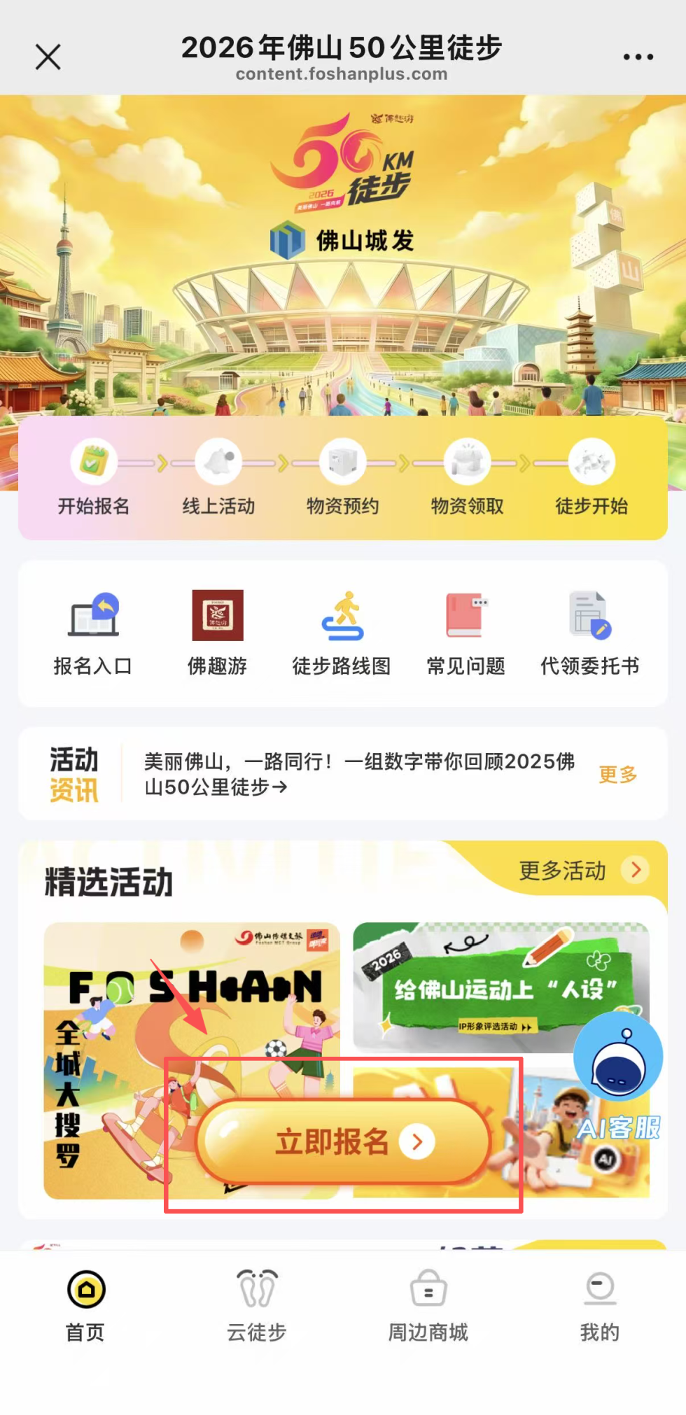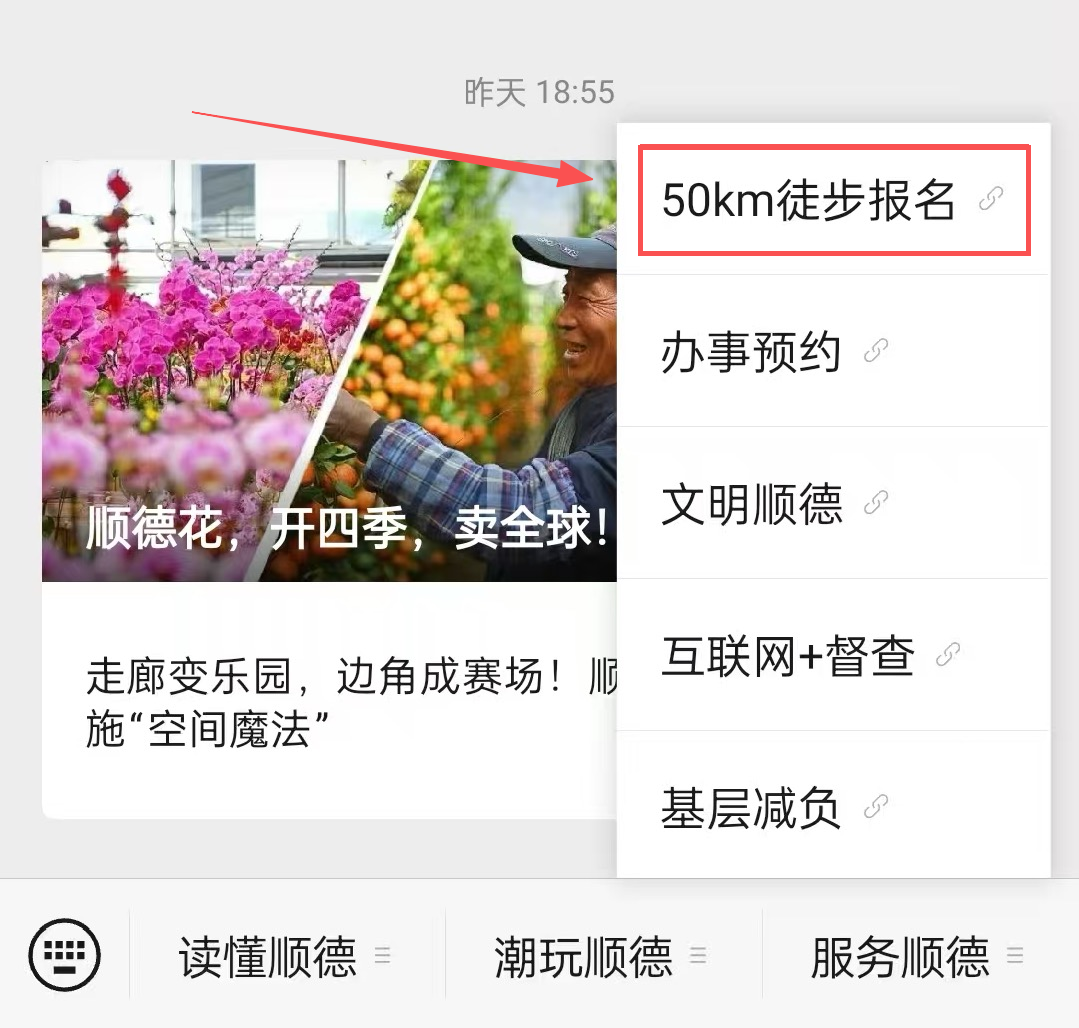 关注“顺德发布”微信公众号,在菜单栏找到【服务顺德】-【50km徒步报名】,点击进入佛山50公里徒步报名页面。