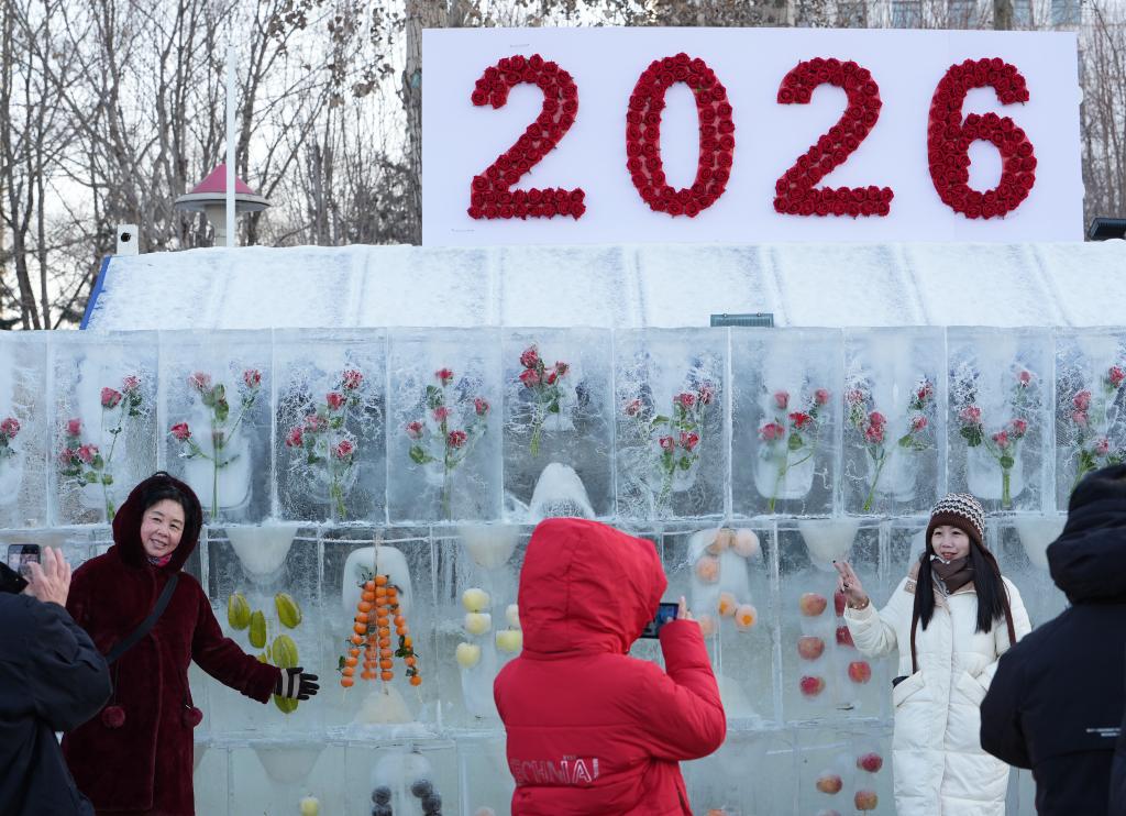 1月1日,沈阳浑河外滩市集,市民在景观墙前打卡拍照。新华社记者 李钢 摄
