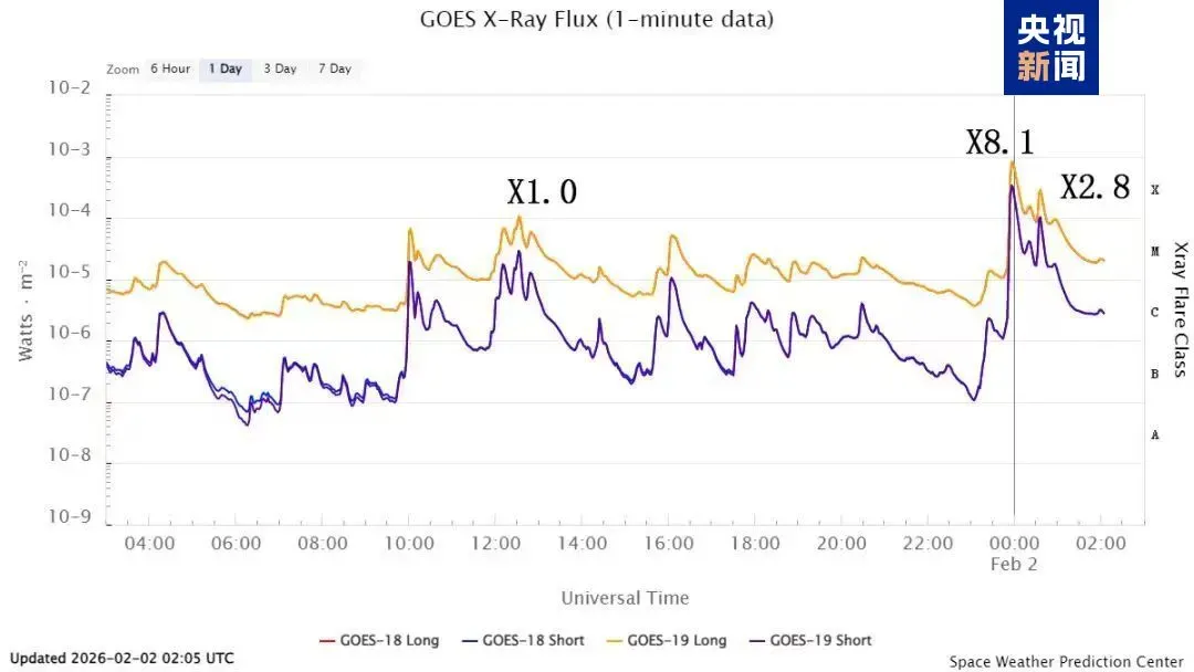记者从中国气象局国家空间天气监测预警中心了解到,北京时间2月1日20时至2月2日9时,太阳活动区14366连续3次爆发X级耀斑,其中,2日早8时左右爆发的耀斑达到X8.1级,是今年太阳出现的最强耀斑过程,同时也是2024年10月以来最强耀斑过程。