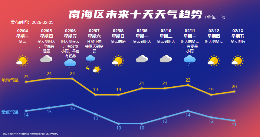 据南海区气象台预计,2026年春运期间(2月2日-3月13日)南海区平均气温接近历史同期(1996-2025年平均,下同)略高,降水量较历史同期偏少2~5成。气温阶段性变化显著,但出现类似2008年大范围持续性低温雨雪冰冻和2016年强寒潮天气的可能性较小,最冷时段出现在2月中旬后期。