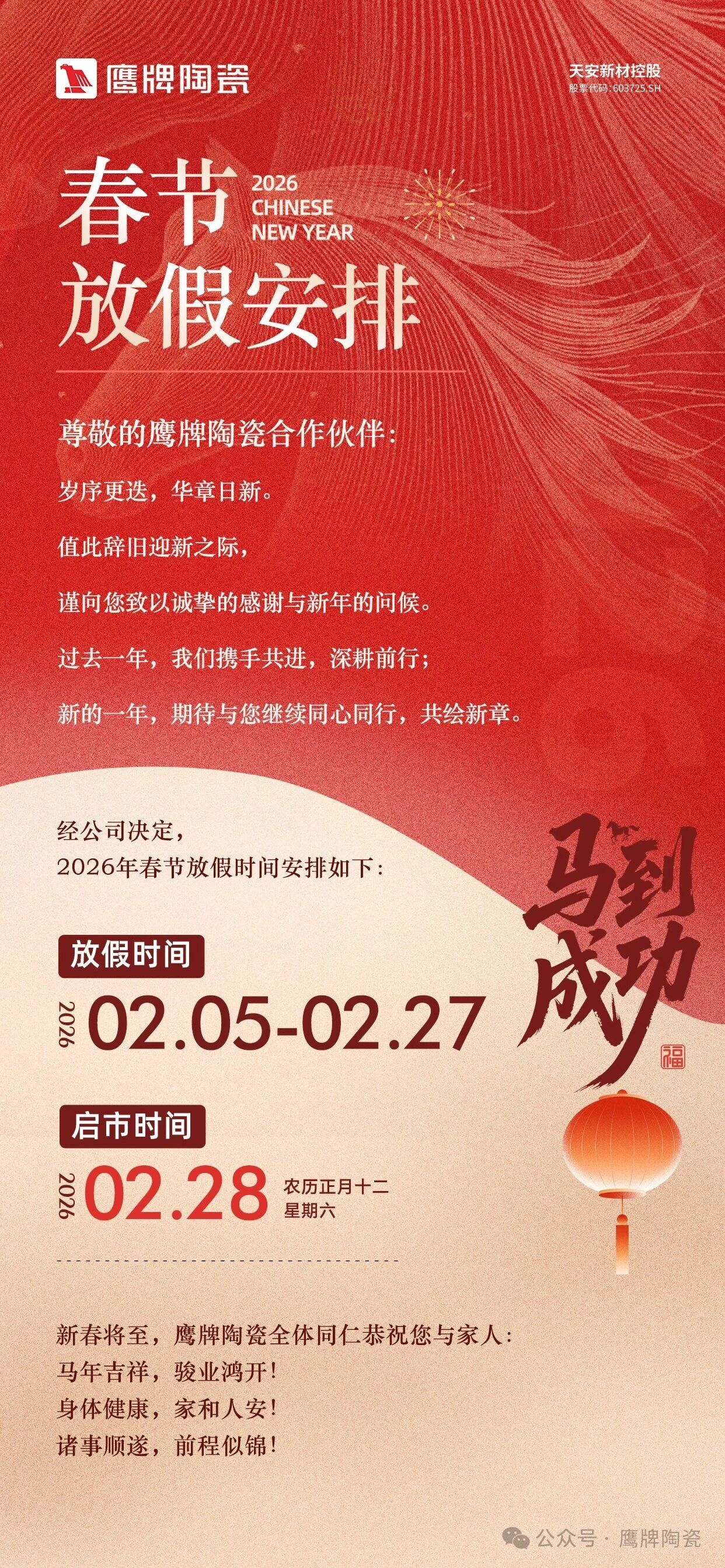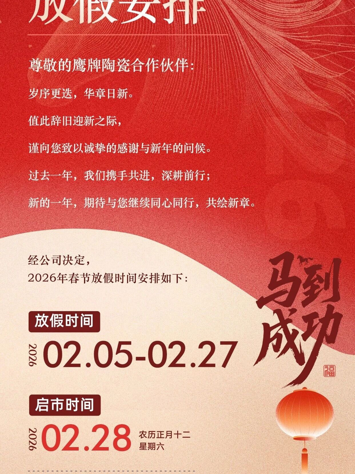 鹰牌陶瓷2026年春节放假通知
