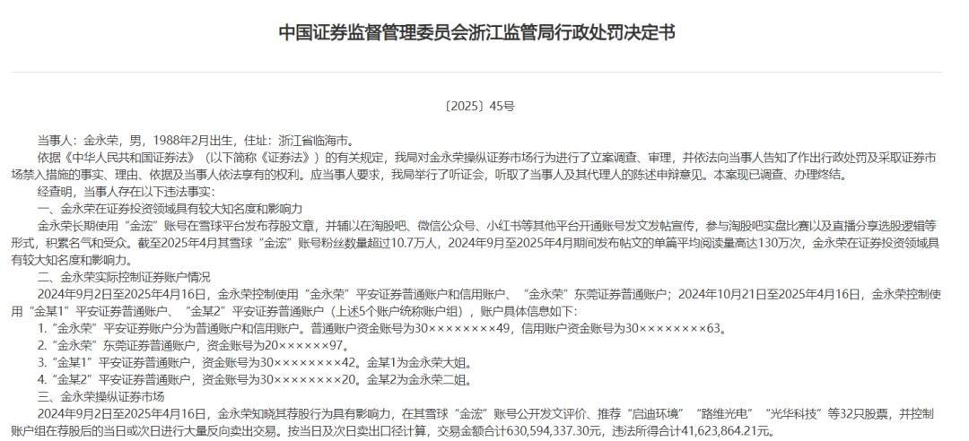 在监管主导部门之外,对于“大V”的严打,监管强调“行政处罚+刑事处罚”双重打击。浙江证监局对金永荣采取“没一罚一”的顶格处罚:没收其违法所得4162.39万元,并处以同等金额罚款,罚没总额超8300万元。此外,浙江证监局还同时对其采取3年证券市场禁入措施。