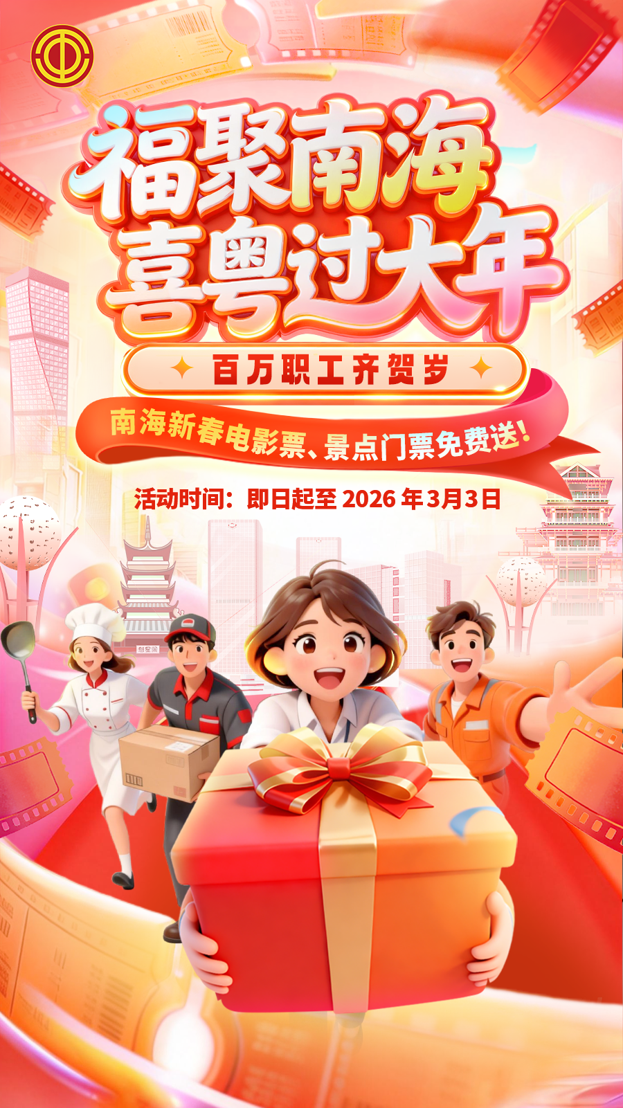 福聚南海 喜粤过大年 百万职工齐贺岁 南海工会十重礼之 文旅欢享礼即将开锣! 超3000张新春电影票 南海五大景点门票免费送 2月6日(周五)10:00开抢