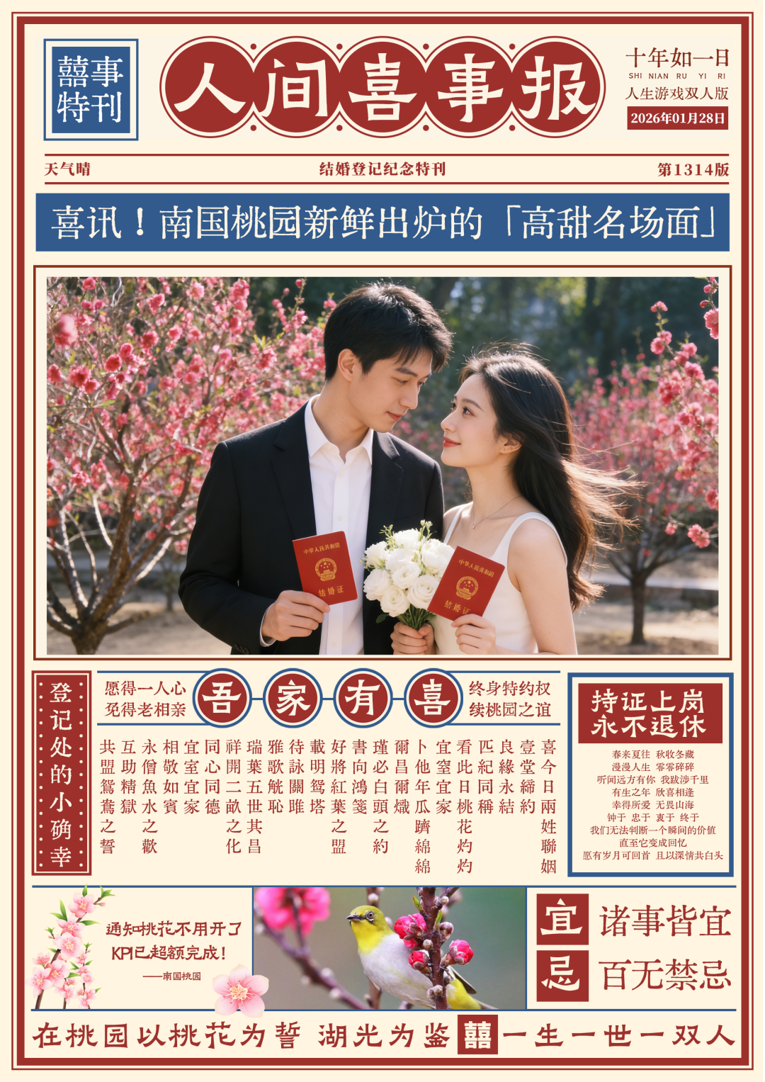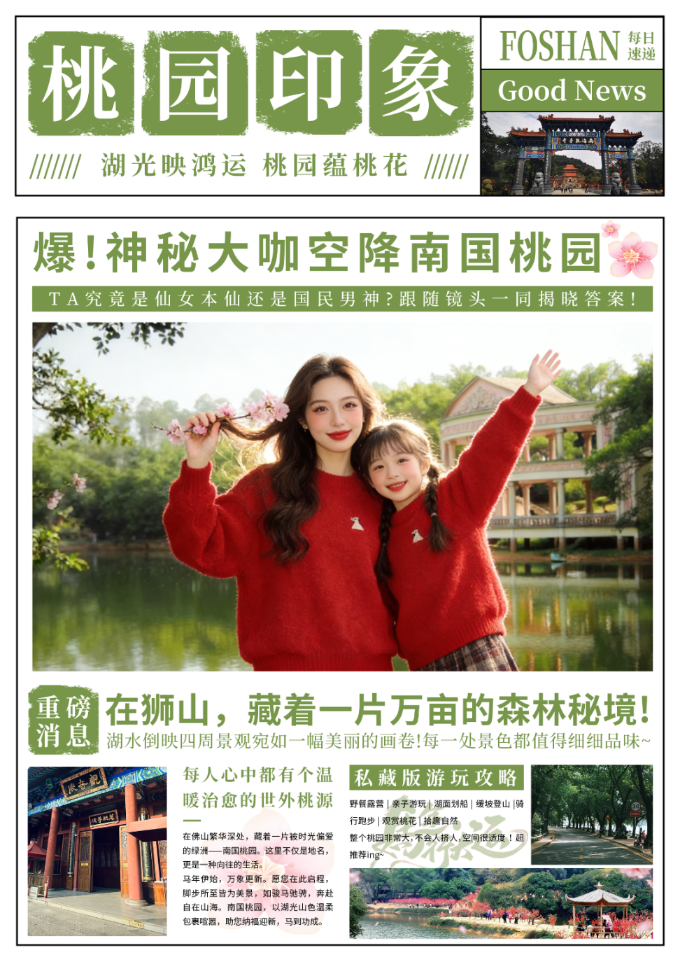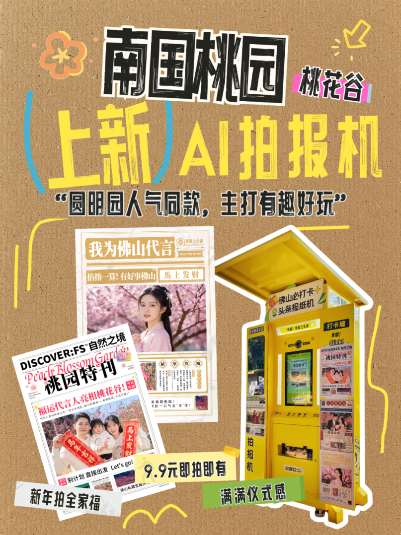 春节即将到来 你还在思考如何“出片” 让朋友圈足够出圈? 狮山·南国桃园帮到你! 红遍全网的AI创意拍报机上线啦 帮你上“头条”、拍大片! 不同于传统打卡道具 这台拍报机将“新闻头条”的仪式感 与春日浪漫完美融合 游客只需三步 就能拥有专属 “报纸纪念册” 1️⃣选一款心仪的模板 2️⃣在桃花背景前摆出最佳姿势 3️⃣扫码支付9.9元 仅需30秒就能生成印着个人影像的报纸 这份“头条”不仅是照片 更成为可收藏、可分享的旅行信物 拿在手中,仿佛瞬间化身 “新闻女王” 成为南国桃园春日盛景里的主角 六大爆款模板的设计 更是精准覆盖不同游客需求 无论是想独自定格桃花烂漫的个人写真 与亲友记录欢聚时刻的结伴同游照 还是全家上阵的温馨合影 都能找到适配的 “头条风格” 更贴心的是 报纸背面印有桃园游览地图 拍完照循着地图畅游 打卡与游玩无缝衔接 让体验感更上一层楼 春节假期 正是桃花盛开的最佳时节 想象一下 在万亩桃园的粉色花海中 你手持专属 “头条报纸” 身后便是烂漫春光 这份独特的新年仪式感 不仅能定格美好瞬间 更能让你的春节打卡在朋友圈中脱颖而出 还在等什么? 这个春节 就来狮山·南国桃园打卡 解锁属于你的“头条时刻” 让春日旅行既有诗意,又有新意! 掌握狮山最新资讯↓ 来源:佛山新闻网、活力桃园 编辑:佛山新闻网 霍浩琳 审核:李仁生、何欣祺、韩世荣 分享 点点赞