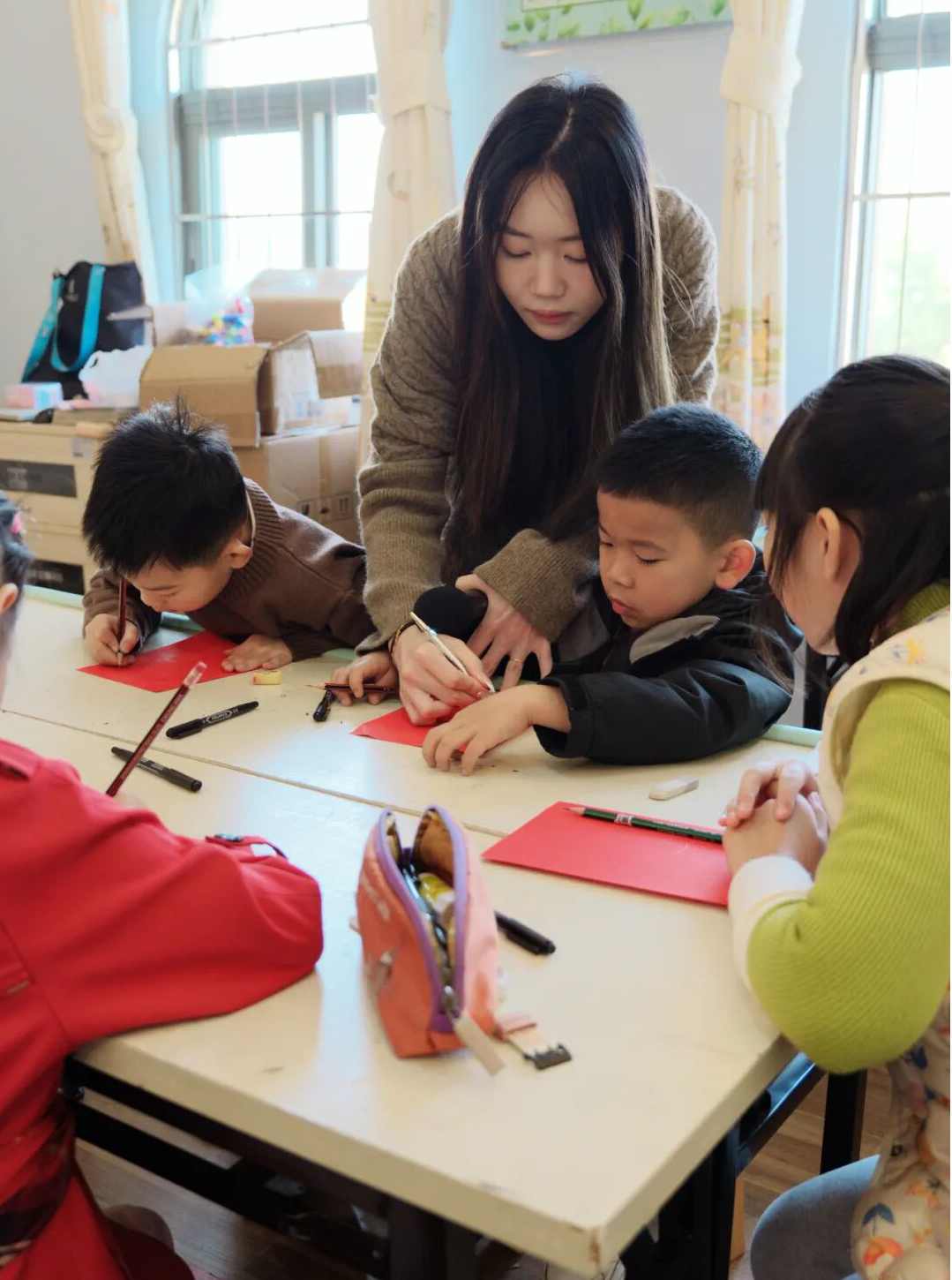 孩子们兴奋地拿起画笔,迫不及待地投入创作。小小的身影围坐在一起,神情专注,一笔一画勾勒出喜庆的灯笼、灵动的鱼儿。有的孩子大胆发挥创意,将家人、飞船、火箭、花朵等元素融入画作,有的写下 “柿柿如意”“福气满满” 等新春寄语。志愿者在一旁轻声指导,现场氛围温馨和谐,处处洋溢着欢声笑语。