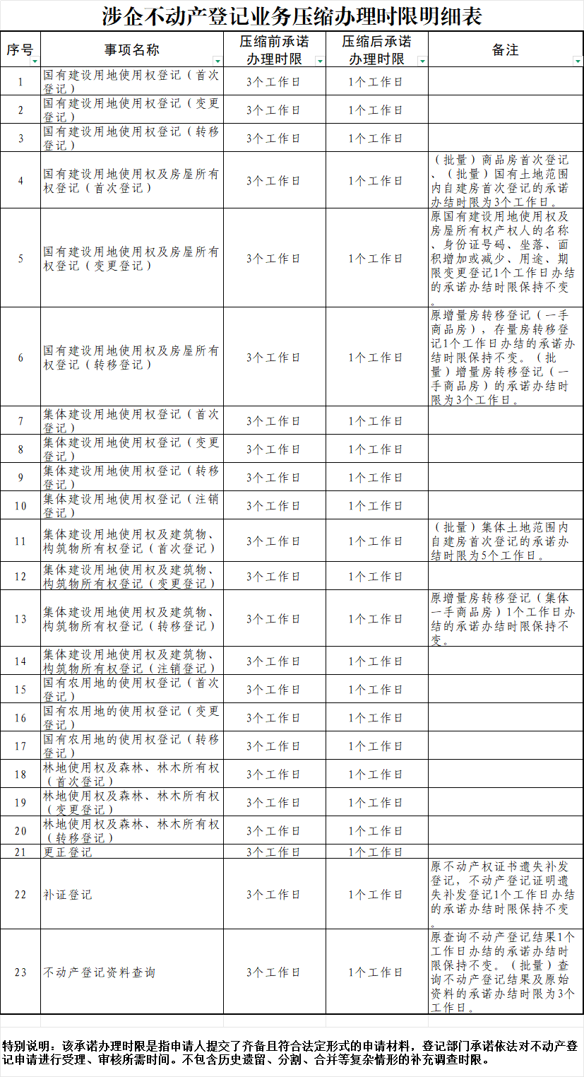 自2026年1月30日起,国有建设用地使用权及房屋所有权登记(首次登记)、国有建设用地使用权及房屋所有权登记(变更登记)、国有建设用地使用权及房屋所有权登记(转移登记)等23项涉企登记业务事项承诺办理时限从原来的3个工作日统一压缩至1个工作日。原承诺办理时限1个工作日或1个小时、即来即办的涉企登记业务保持现有办理时限不变。