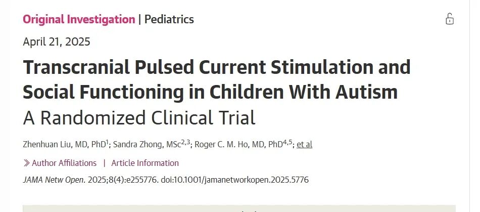 2025年4月21日,由广州中医药大学刘振寰教授领衔的中(中国)新(新加坡)跨国科研团队,在国际顶级医学期刊《美国医学会杂志》旗下的《JAMA Network Open》(影响因子13.8,中科院1区)发表了题为“Transcranial Pulsed Current Stimulation and Social Functioning in Children With Autism:A Randomized Clinical Trial”(经颅脉冲电流刺激与孤独症儿童社交功能:一项随机临床试验)的研究论文。本研究取得了突破性研究成果,为全球孤独症谱系障碍(ASD)治疗开辟全新路径!