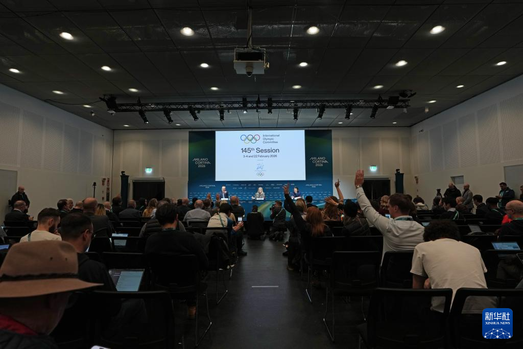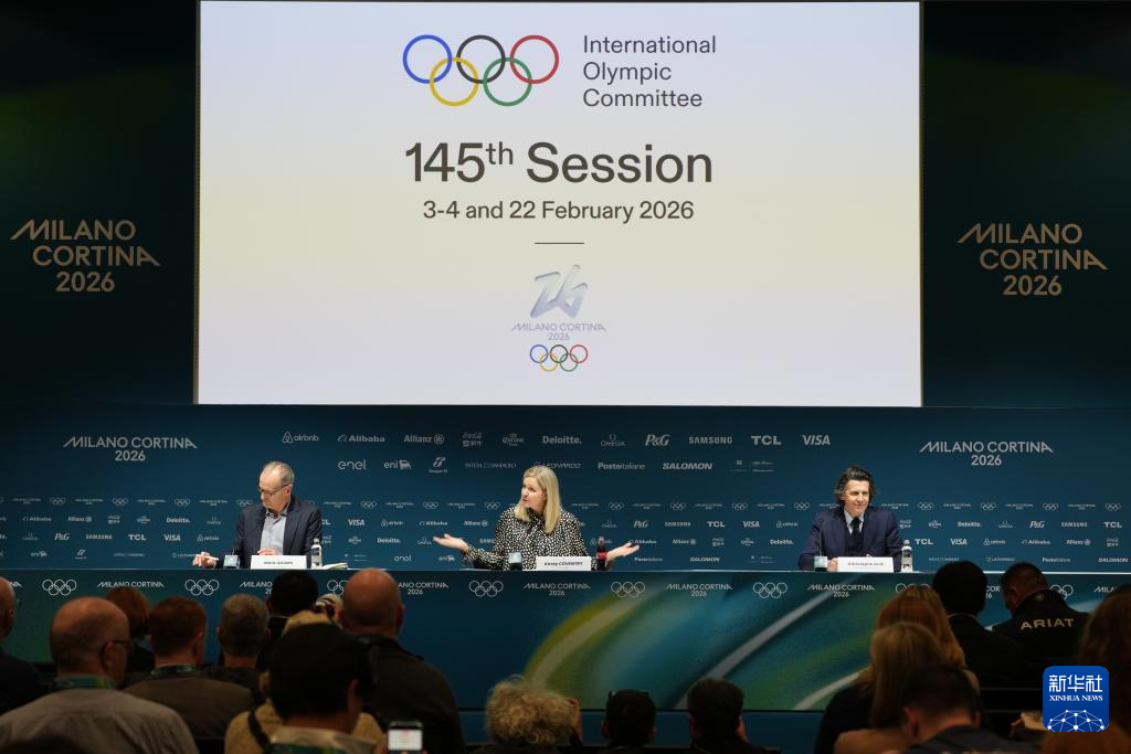 当地时间2月4日,第145次国际奥委会全会在位于意大利米兰的米兰-科尔蒂纳冬奥会主媒体中心举行新闻发布会。