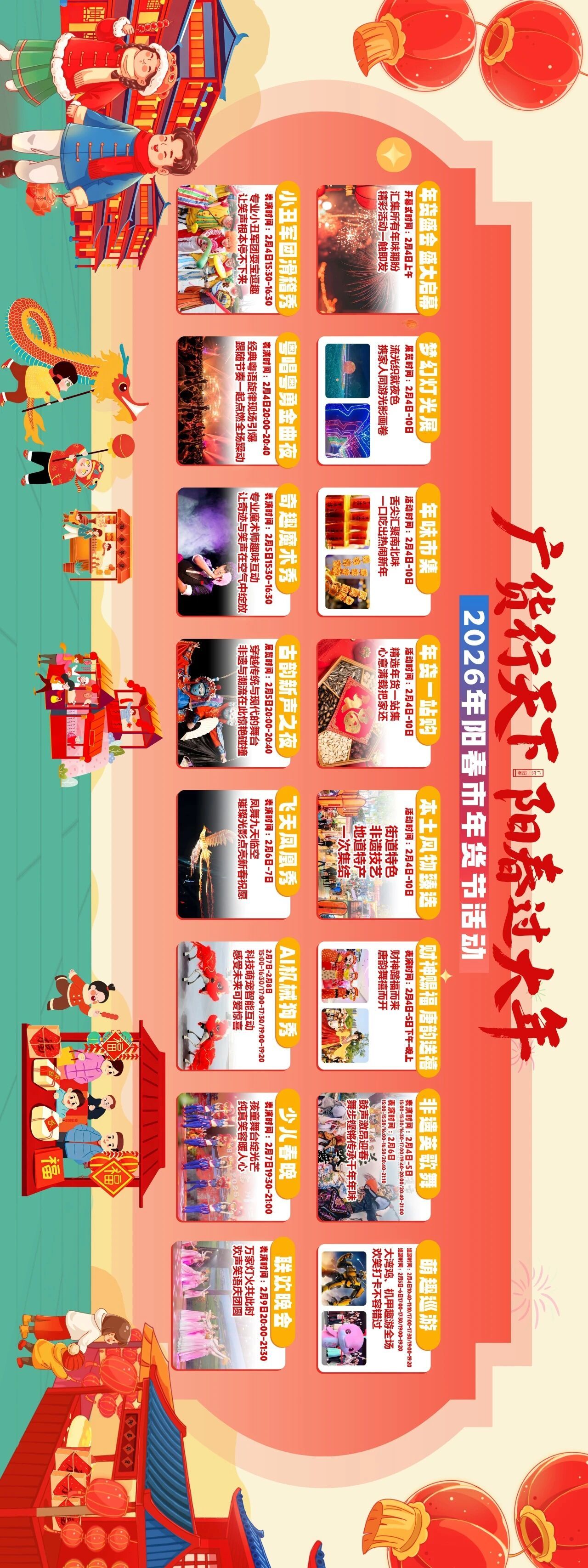 据了解,本次年货节将持续至2月10日,为期七天的活动精彩不断。除了丰富的年货展销,现场还将轮番上演潮汕英歌舞、奇趣欢乐魔术秀、智趣AI机械狗表演、飞天凤凰表演等特色节目,全运会吉祥物与科幻感十足的“大黄蜂”将进行互动巡游,“财神爷”也会定时为市民派发新春红包。2月4日晚,“粤唱粤勇金曲夜”将带来经典金曲;2月5日是古韵新声之夜;2月6日至8日还将推出阳春少儿春晚等精彩内容,让市民游客天天有看点、日日有惊喜。这个新春,不妨约上家人朋友,前往阳春东湖公园,在选购优质年货的同时,感受非遗的魅力,欣赏精彩绝伦的表演,在浓浓的年味中迎接新春佳节的到来。