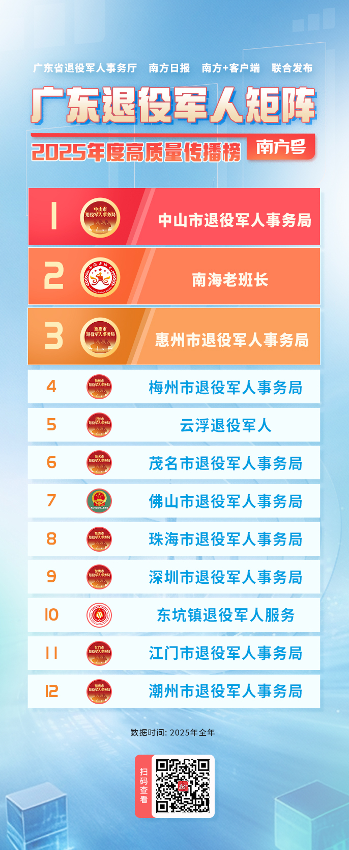 近日,广东退役军人矩阵南方号2025年度排行榜重磅发布!
