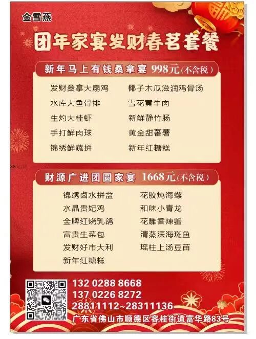 如果说九大簋是款待贵客的隆重仪式,那团圆宴就是家人团聚的温馨时刻。在容桂,多家餐厅都准备了各具特色的团圆宴套餐,让每一家的团圆都简单而不失丰盛。