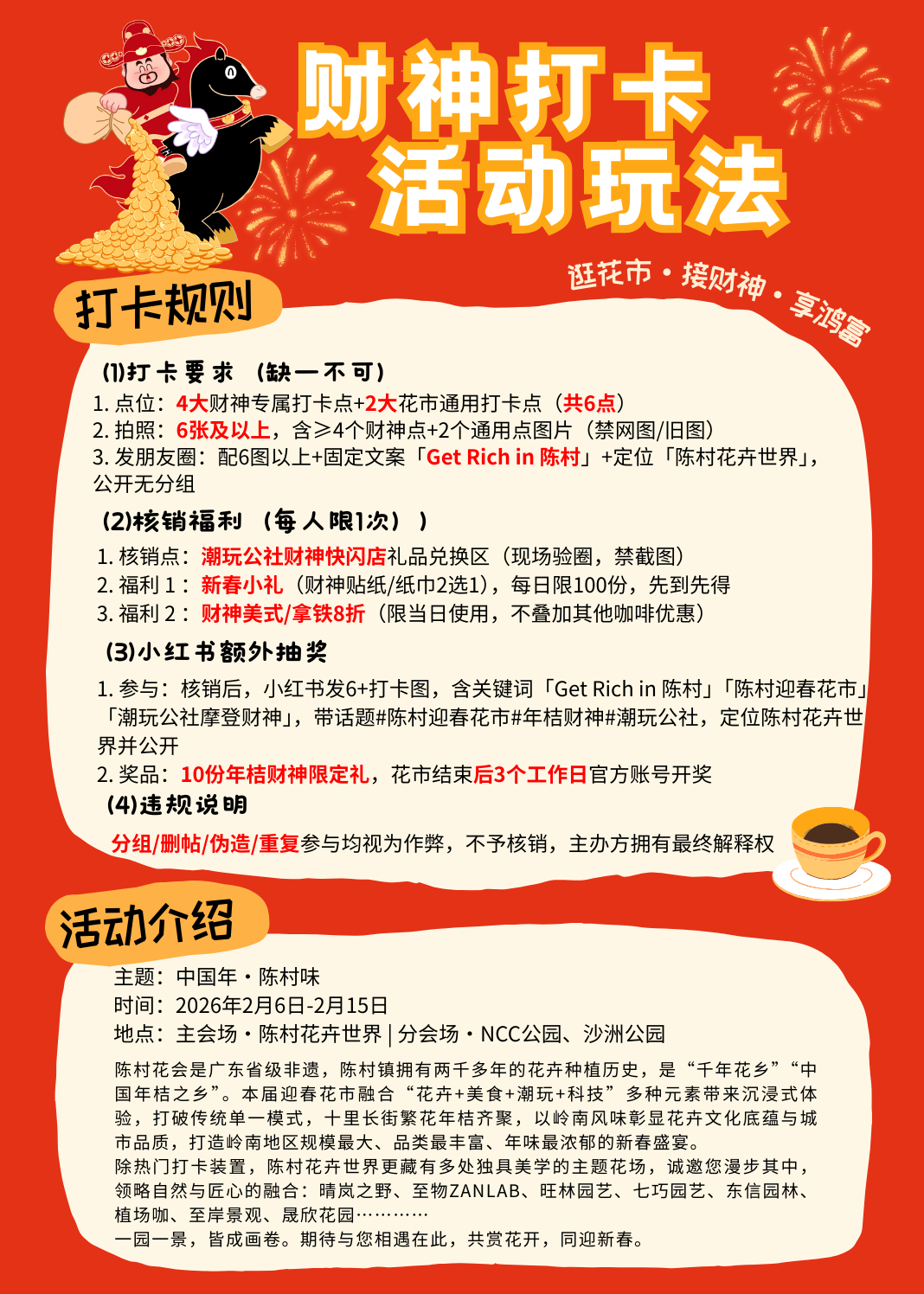 1.参与:核销后,小红书发6+打卡图,含关键词「Get Rich in 陈村」「陈村迎春花市」「潮玩公社摩登财神」,带话题#陈村迎春花市#年桔财神#潮玩公社,定位陈村花卉世界并公开。