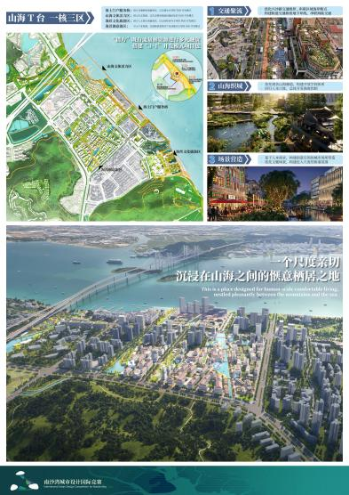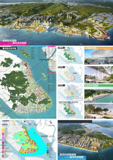 方案从“山海相逢、岭南水乡”中汲取灵感,提出“山海绿港、潮聚湾芯”的概念,并通过以下五大策略塑造特色的空间体系:首先,通过生态筑基构建山海城一体的韧性网络。第二,强调产业共兴:构建“文旅体智”超链走廊。第三,强化城景交融:塑造世界级山海风景。第四,全域链接:在交通层面,推动海陆空地下多维联通。第五,共创共享:以超级湾民社群引领新风尚。