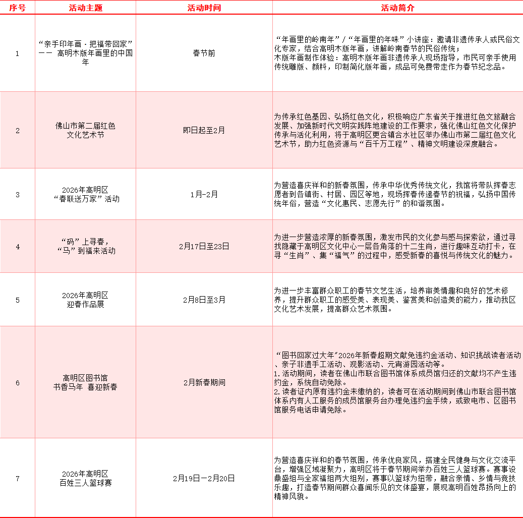 从2月19日(大年初三)持续至2月20日(大年初四),高明区将在苏村鱼尾龙广场举办百姓三人篮球赛。赛事设鼎盛组与全家福组两大组别,与连续多年火爆的龙狮大巡游、非遗展演深度联动,为市民游客打造一场“民俗+体育”沉浸式盛宴。活动详情可进入区篮球协会微信公众号了解。