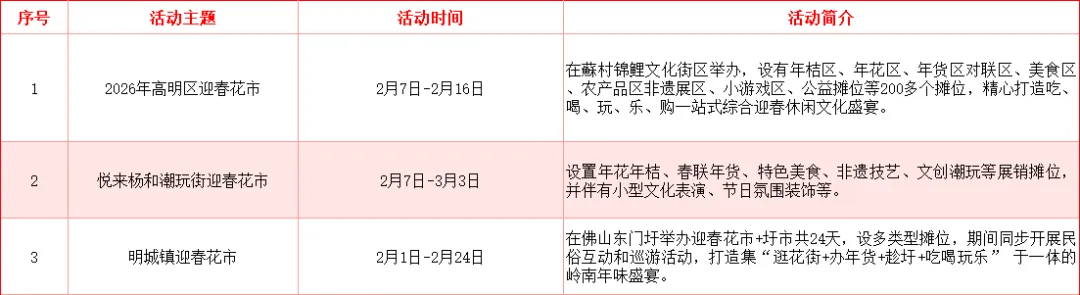 明城镇迎春花市在佛山东门圩持续24天开市。花市位于明城镇历史文化核心区,留存这老高明的商业与人文印记,这里结合圩市特色(逢1、4、7传统圩日开圩),打造集“赏花+购物+娱乐+趁圩”于一体的岭南年味盛宴。