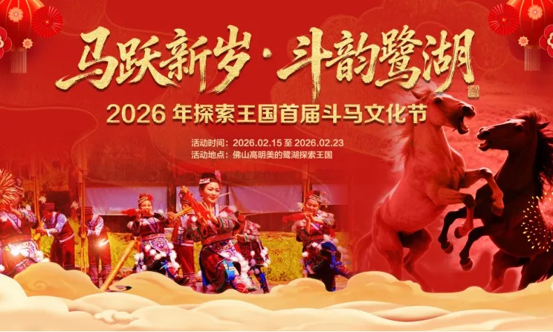 美的鹭湖探索王国举办首届斗马文化节(2月15日-23日),每天三场专业斗马赛(11:00、14:00、16:00)将准时上演,将苗、瑶族传承数百年的非遗斗马活动与亲子互动深度融合。
