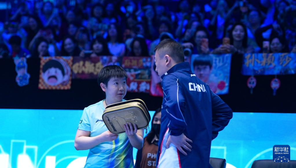 2月7日,孙颖莎(左)与教练马琳在比赛结束后沟通。