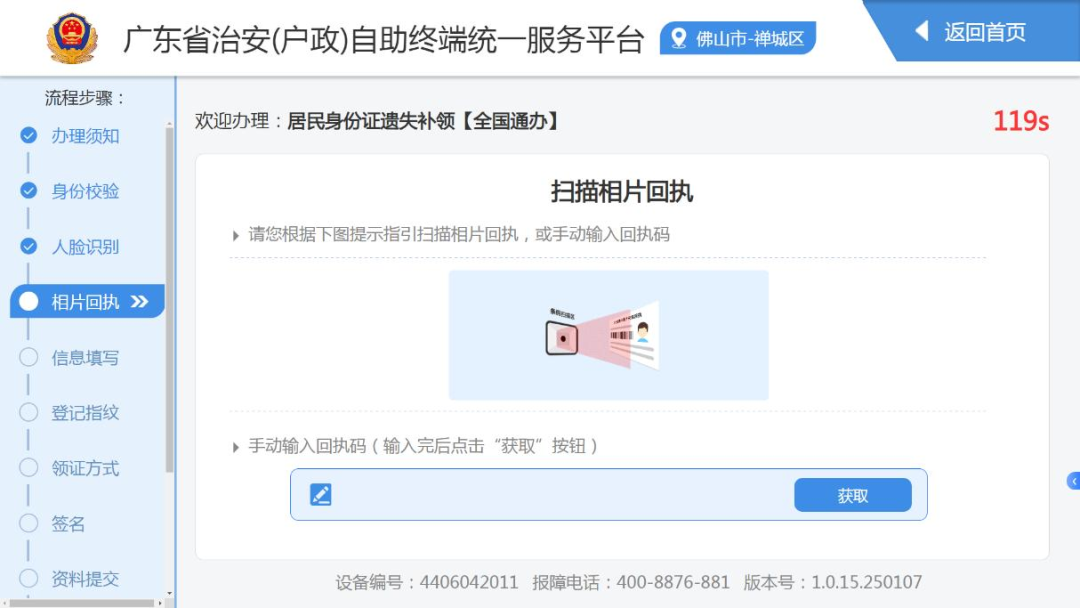 04 现场采集照片及比对,扫描或输入照片回执码。