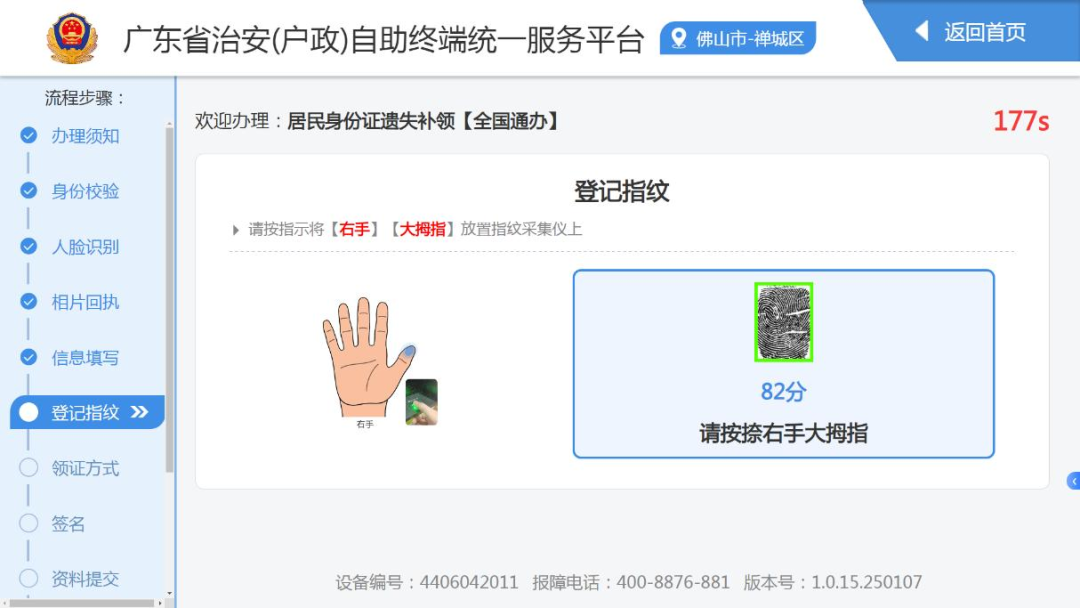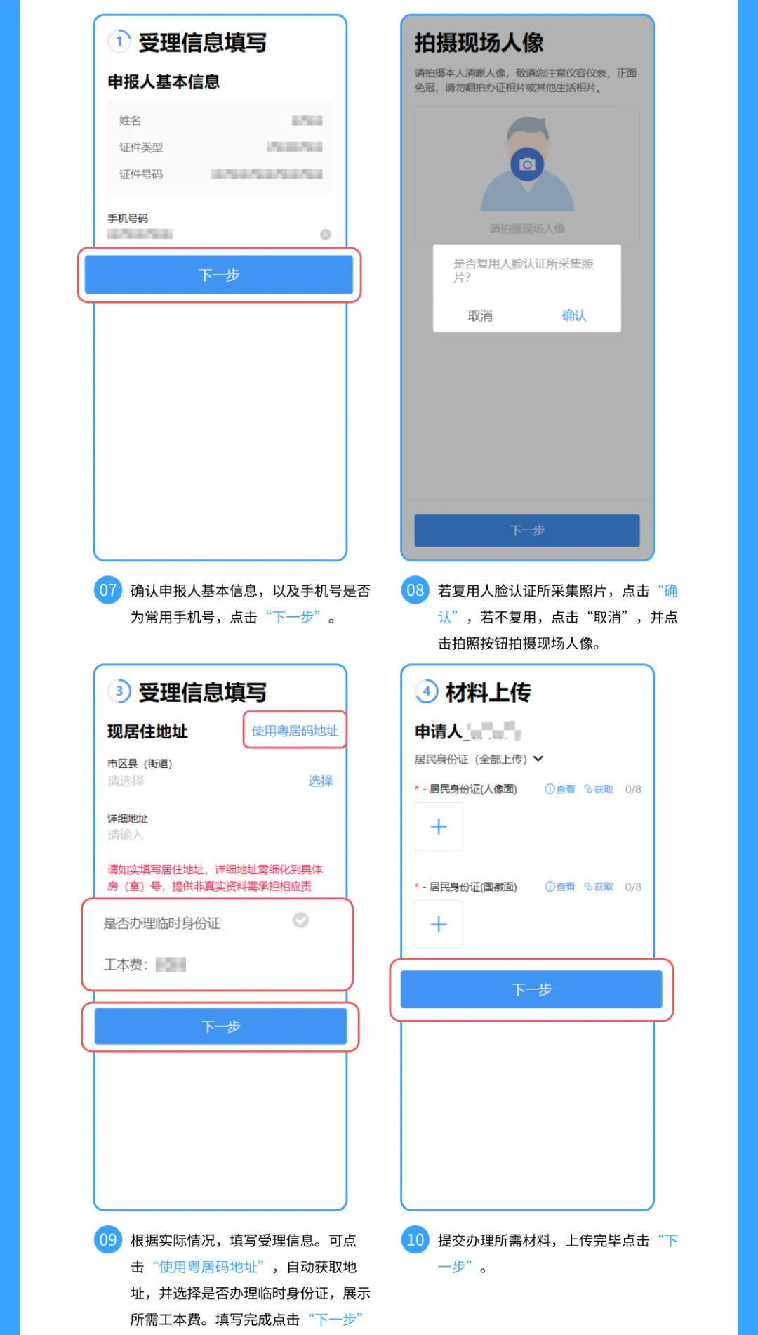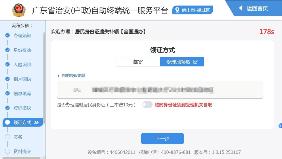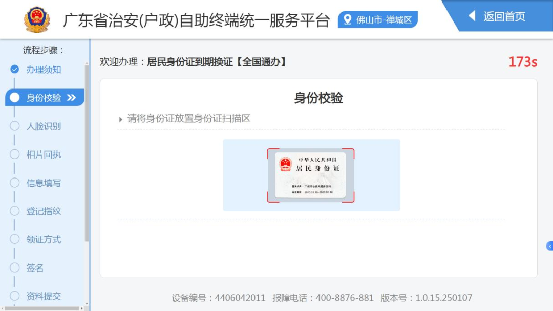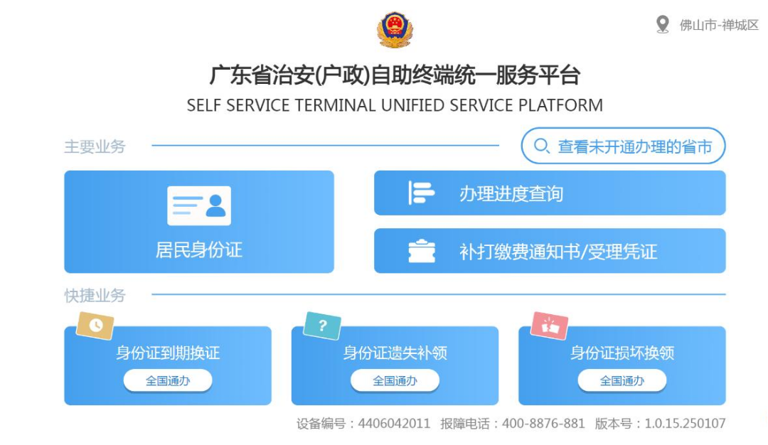 温馨提醒:在申办业务前,非广东省户籍居民请先在自助机首页查看您所在的城市,是否开通“跨省通办”功能。同时,提前到具有相关资质的相馆拍摄照片,并持有居民身份证数字相片采集回执,这样在自助机上办理身份证业务更高效。